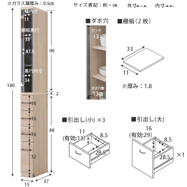 | 商品仕様 | 前板:塩ビ化粧繊維板 その他の板:プリント化粧繊維板 ガラス:約5mm厚の強化ガラス |