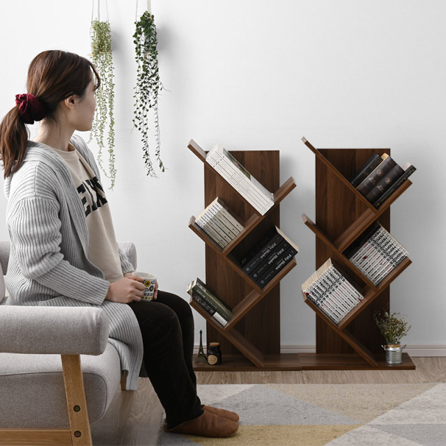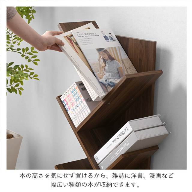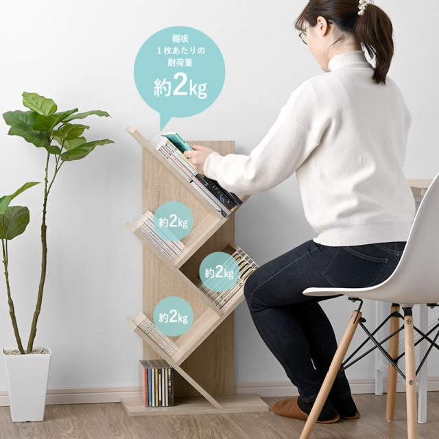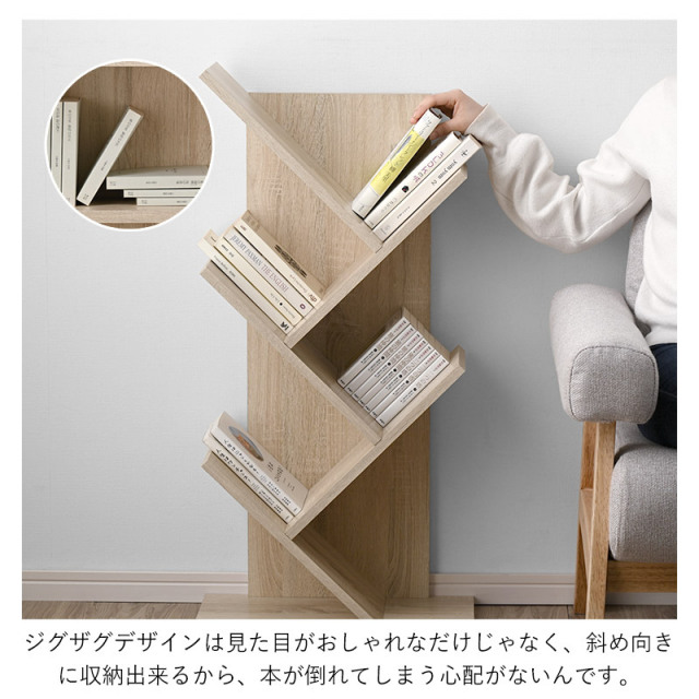 | 置くだけでおしゃれに、お部屋のワンポイントになるジグザグデザインの本棚。 本の高さを気にせず置けるから、雑誌に洋書、漫画など幅広い種類の本が収納できます。 ジグザグデザインは見た目がおしゃれなだけじゃなく、斜め向きに収納できるから、本が倒れてしまう心配がありません。 | |