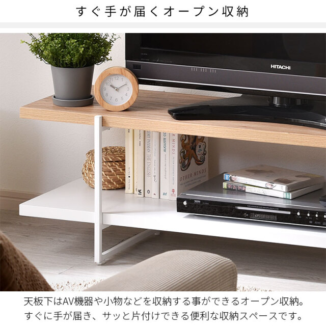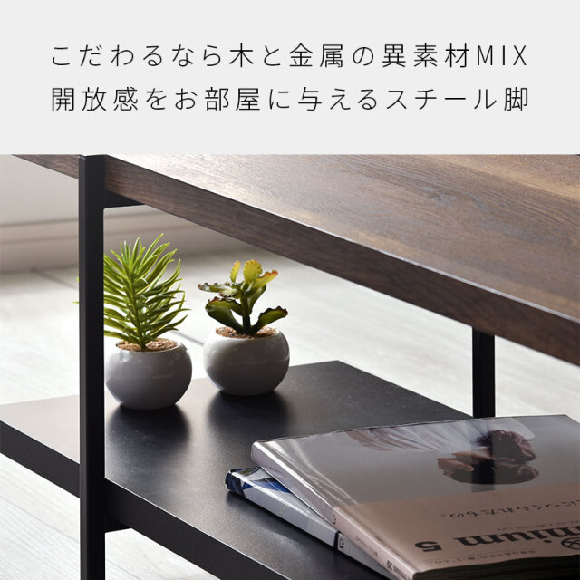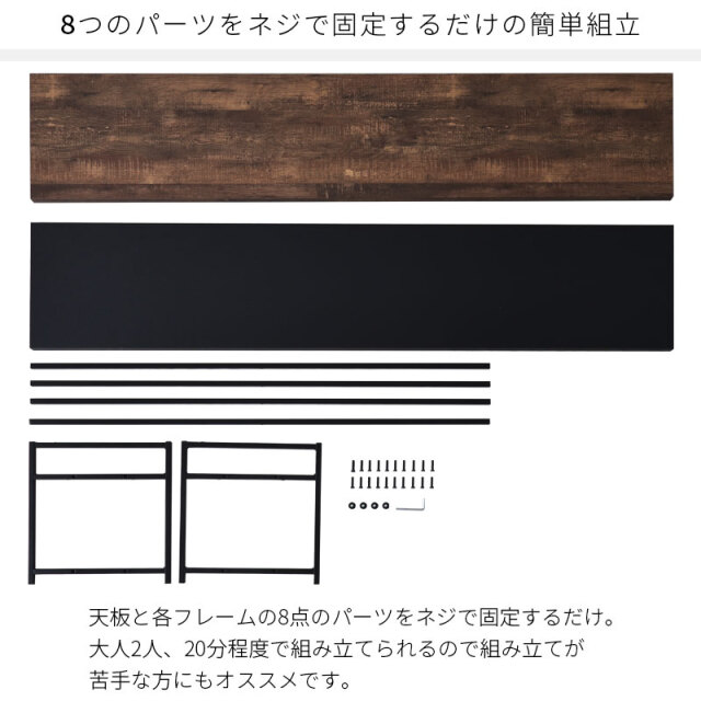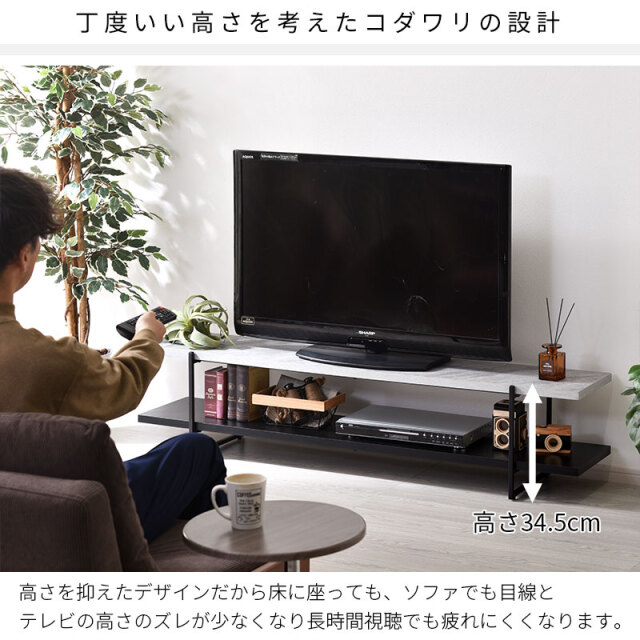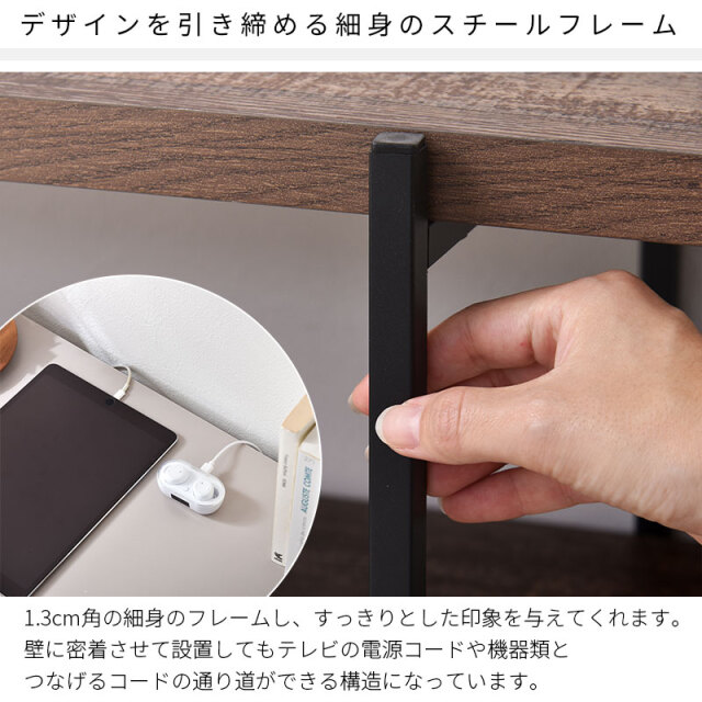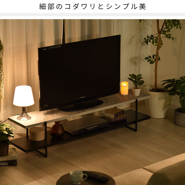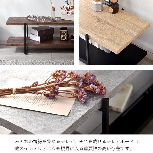 | 木の質感を感じさせる木目調の天板に黒いスチールのフレームを組み合わせた西海岸やブルックリンスタイルに最適なテレビボードになります。 天板と各フレームの6点のパーツをネジで固定するだけ。 大人でしたら20分程度で組み立てられるので組み立てが苦手な方にもオススメです。 上質な木目がリアルに浮き上がり、木の表情が生き生きと見える木目調とスタイリッシュさを強調するストーン調の化粧板を使用しています。 | |