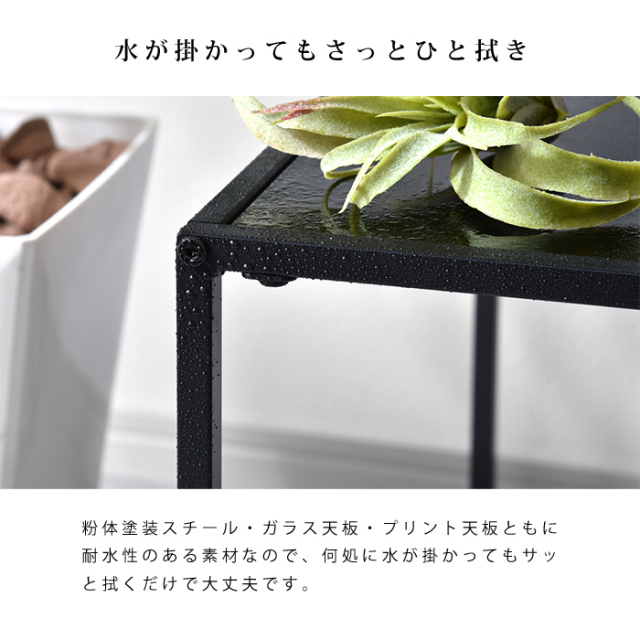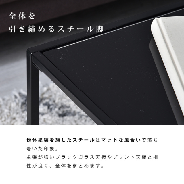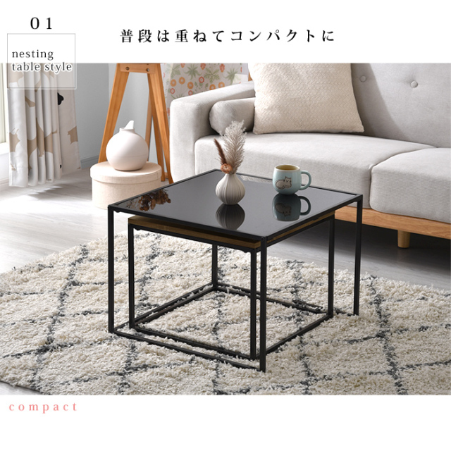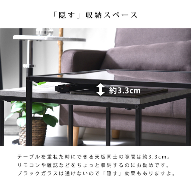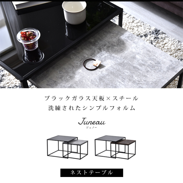| ブラックガラス天板×スチールの、洗練されたシンプルフォルム 【ネストテーブル ジュノー】 艶やかで美しいブラックガラスの天板に、無骨なスチールがマッチする。 直線的なデザインはシンプルながら洗練されており、 お部屋をシックな雰囲気に引き立てます。 ガラステーブルの下に入るサイズの小さめのテーブルは ストーン調・木目調から選べます。 石や木の質感を再現したリアルなプリントが美しく、 インテリアをワンランク引き上げます。 粉体塗装を施したスチールはマットな風合いで落ち着いた印象。 主張が強いブラックガラス天板やプリント天板と相性が良く、全体をまとめます。 ネストテーブルの魅力は、自由なレイアウトを楽しめること。 普段は重ねてコンパクトに、来客時は広げて大きく。 それぞれ分けてm単品使いもできますよ。 テーブルを重ねた時にできる天板同士の隙間は約3.3cm。 リモコンや雑誌などをちょっと収納するのにお勧めです。 ブラックガラスは透けないので「隠す」効果もあります。 | |
