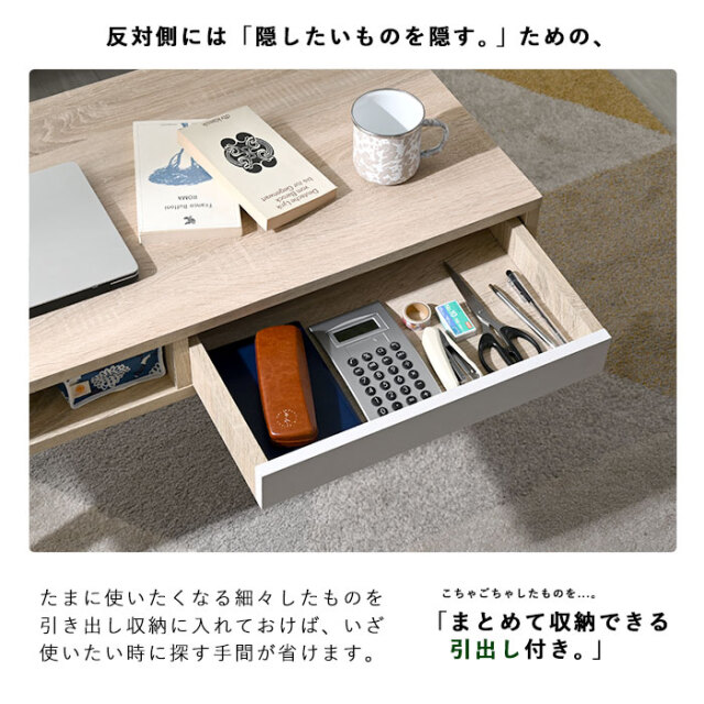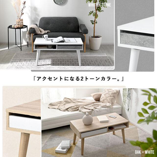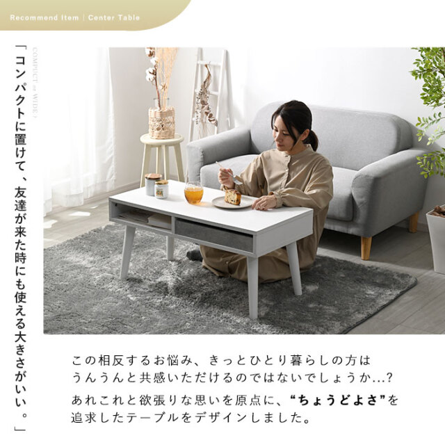| コンパクトに置けて、でも友達が来た時にも使える大きさが良い、、。 そんな、ひとり暮らしのお悩みあるあるを元に、ちょうどいいテーブルをデザインしました。 ・脚を取り付けるだけの半完成品 ・頻繁に使うものを入れて置ける、オープン収納スペース ・たまに使う物や細々したものは、引出し収納にイン ・幅を抑えて、奥行きにややゆとりを持たせた絶妙なサイズ設定 ・お部屋にアクセントを添える2トーンのカラーリング ・床に座っても、ソファからでもちょうどいい高さ設定 ・お料理が映える天板 などなど、魅力の詰まったアイテムが完成しました ぜひぜひ、インテリアの選択肢に入れて頂きたいアイテムです。 | |