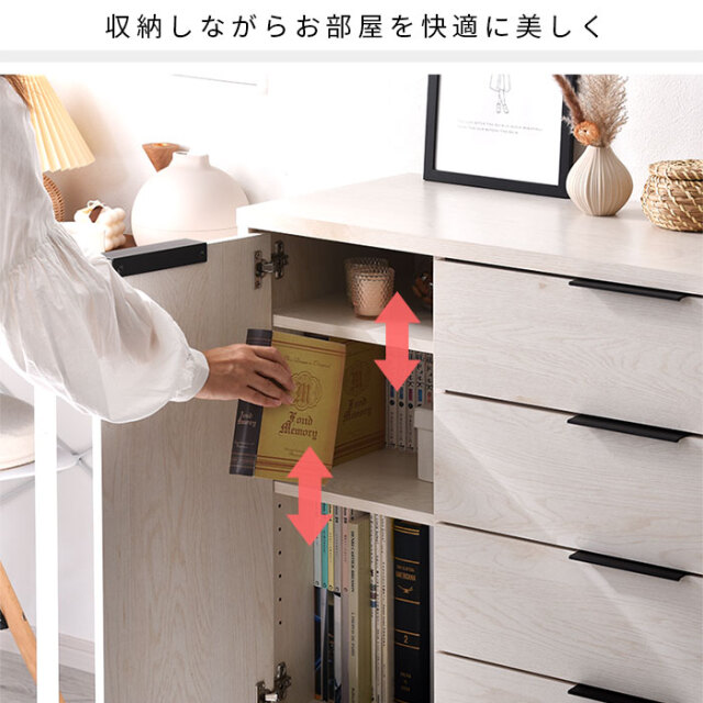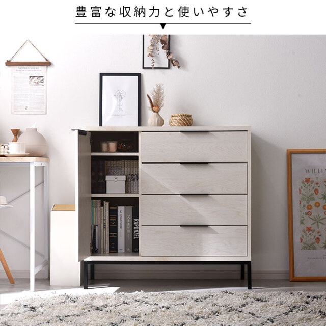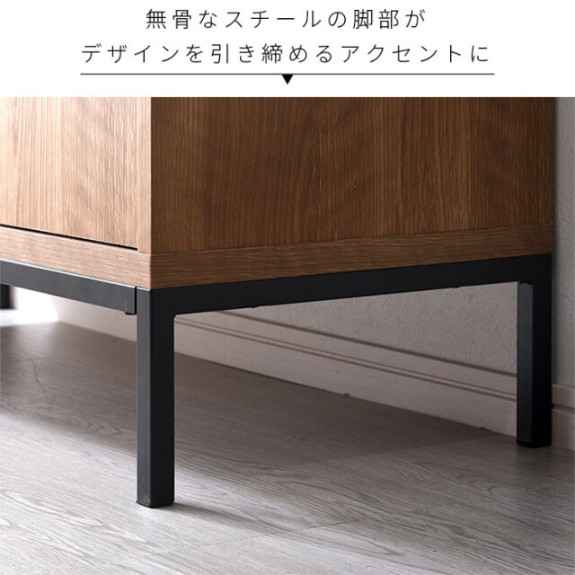 | 生活感の出やすい雑多な小物も扉で隠してすっきり。 中身の見えない大容量の収納スペースと木目調が魅力の美しいデザイン性で生活感を抑えた上質なお部屋づくりをして頂けます。 ブラックスチールの脚部で程良く個性を持たせたシンプルなフォルムの中に上質さを感じさせるデザインになっています。 見栄えはスッキリ美しく洗練された空間作りができます。 | |