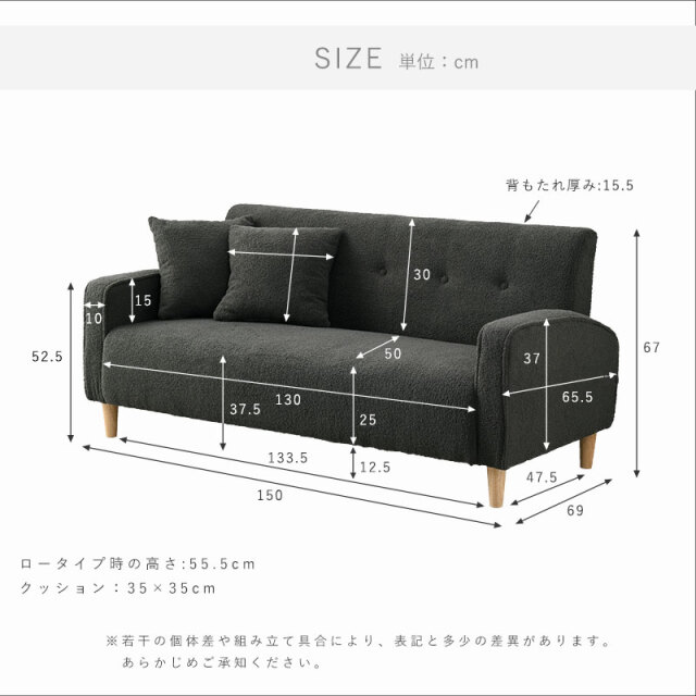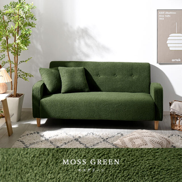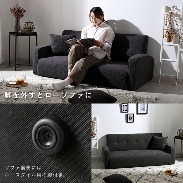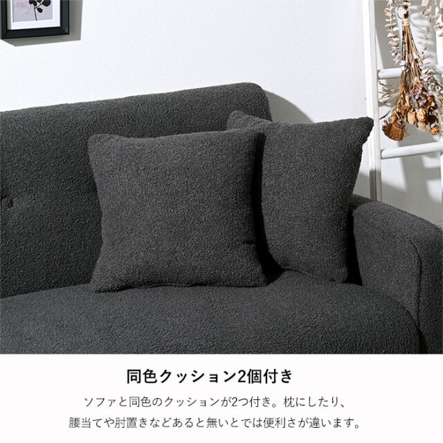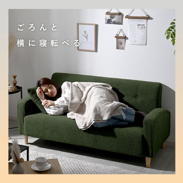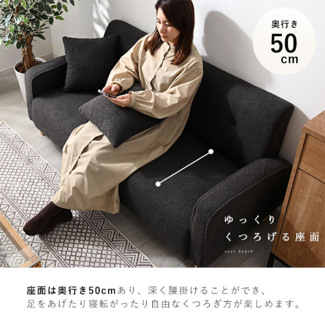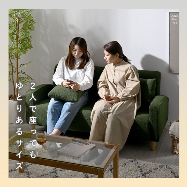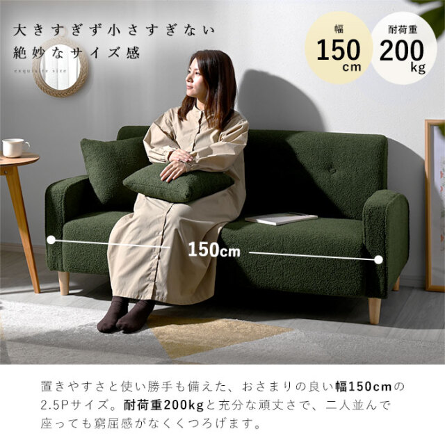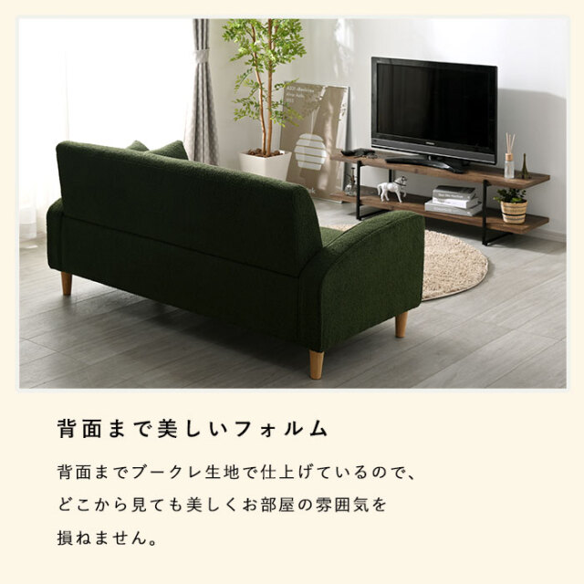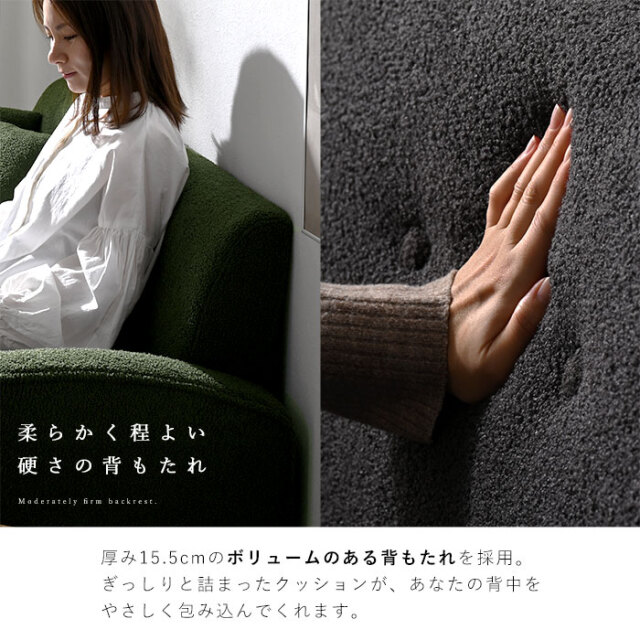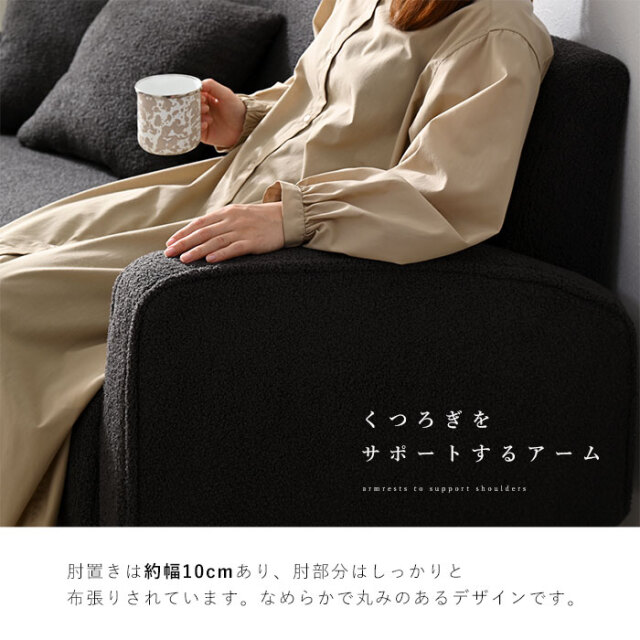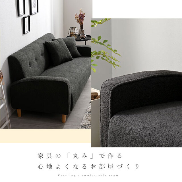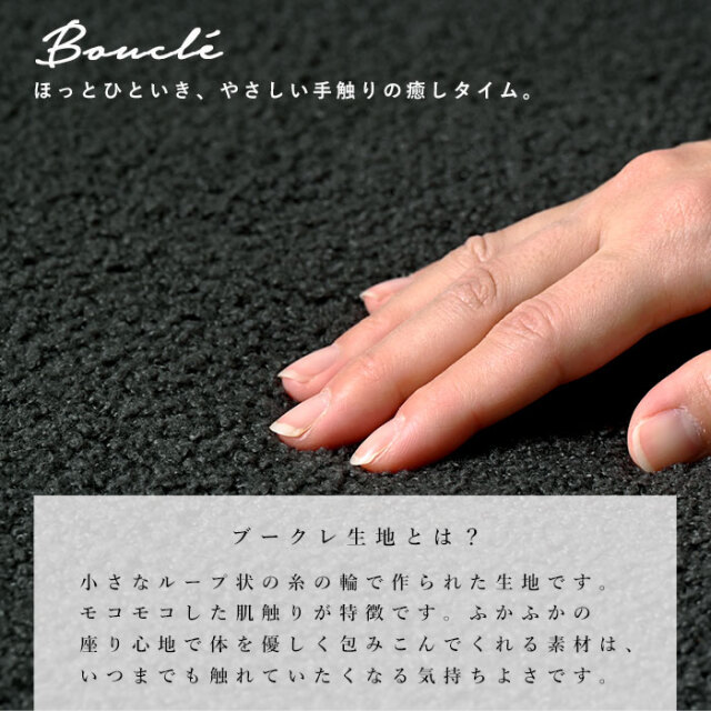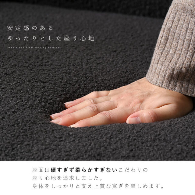 | あなたの心を温める、癒しの時間。 日々の疲れが癒されるような丸みのある心温まるフォルムで、お部屋の中に柔らかい雰囲気をプラスできるブークレ生地と、あたたかみのある木製の脚が融合したおしゃれなデザイン。 ほっとひといき、やさしい手触りの癒しタイム。 小さなループ状の糸の輪で作られた生地です。 モコモコした肌触りが特徴です。ふかふかの座り心地で体を優しく包みこんでくれる素材は、いつまでも触れていたくなる気持ちよさです。 家具の「丸み」で作る心地よくなるお部屋づくり ソファでは座っているだけでなく、あぐらをかいたり、横になって寝転んで過ごす事もできる為、様々な姿勢で身体を休めながら過ごせる快適な座り心地のソファです。 2人で座ってもゆとりあるサイズ ごろんと横に寝転べる 置きやすさと使い勝手も備えた、おさまりの良い幅150cmの2.5Pサイズ。耐荷重200kgと充分な頑丈さで、二人並んで座ってもゆっくりくつろげます。 | |