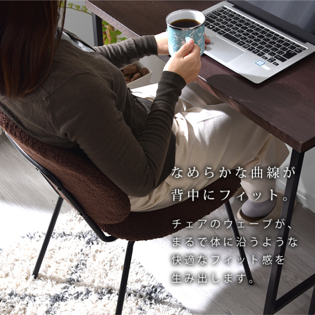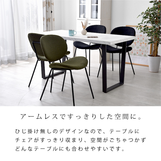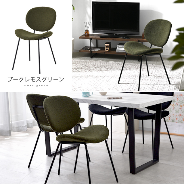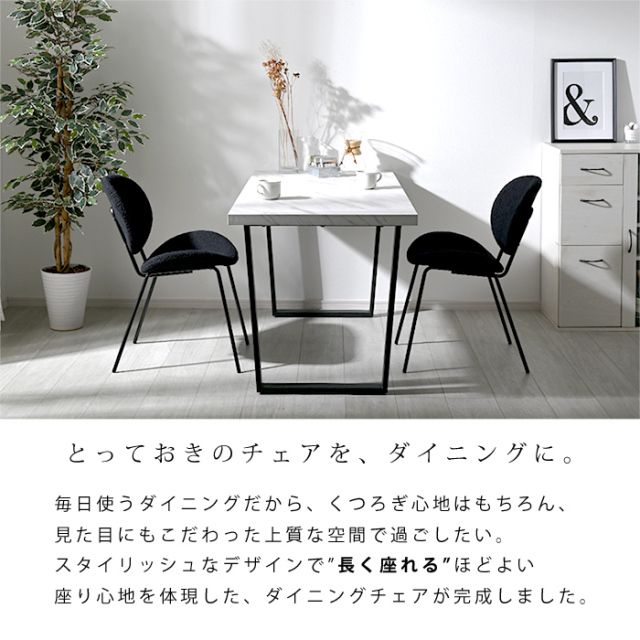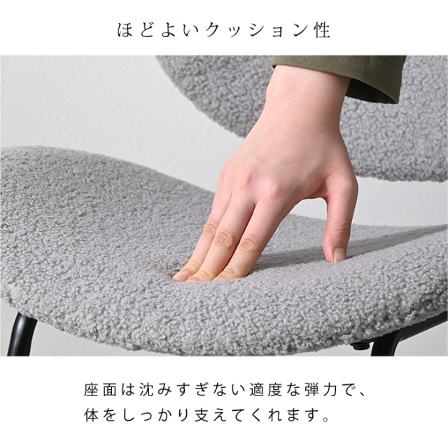 | 緩やかな曲線を描く背もたれと座面、もこもこ生地にスチール製の脚。 異素材MIXで美しくつくり上げた、シンプルモダンなダイニングチェア。 【ダイニングチェア CUFU(クフ)ブークレ生地タイプ】 毎日使うダイニングだから、くつろぎ心地はもちろん、見た目にもこだわった上質な空間で過ごしたい。 スタイリッシュなデザインで”長く座れる”ほどよい座り心地を体現した、ダイニングチェアが完成しました。 曲線を描く美しい背もたれと座面は強度と耐久性を備えたポリプロピレン製。張地にはブークレ生地を採用しました。 チェアのウェーブは、まるで体に沿うような快適なフィット感を生み出します。 座面は沈みすぎない適度な弾力で、体をしっかり支えてくれ、座面高は約45cmと、ダイニングでもデスクでもご使用いただける汎用性の高い設計。 スチール製の脚にはサビや汚れに強い粉体塗装を施し、マットで上品な質感に仕上げています。 ひじ掛け無しのデザインなので、テーブルにチェアがすっきり収まり、空間がごちゃつかずどんなテーブルにも合わせやすいのがうれしいポイント。 耐荷重は100kgとしっかりあるので気兼ねなくチェアに身を任せられますよ。 組み立ては、脚と背もたれ・座面を付属の六角レンチでねじ留めするだけですぐに完成するので、届いたその日からお使いいただけます。 | |