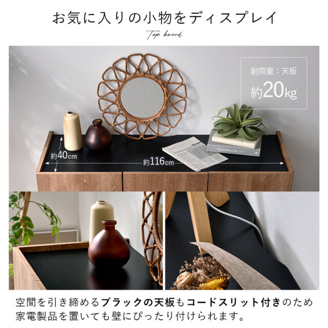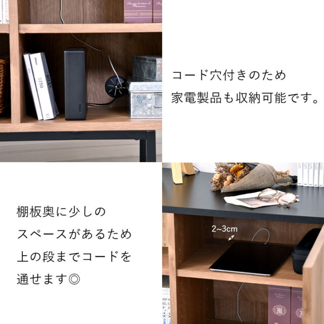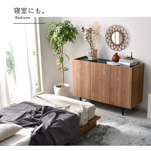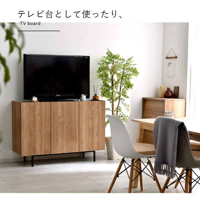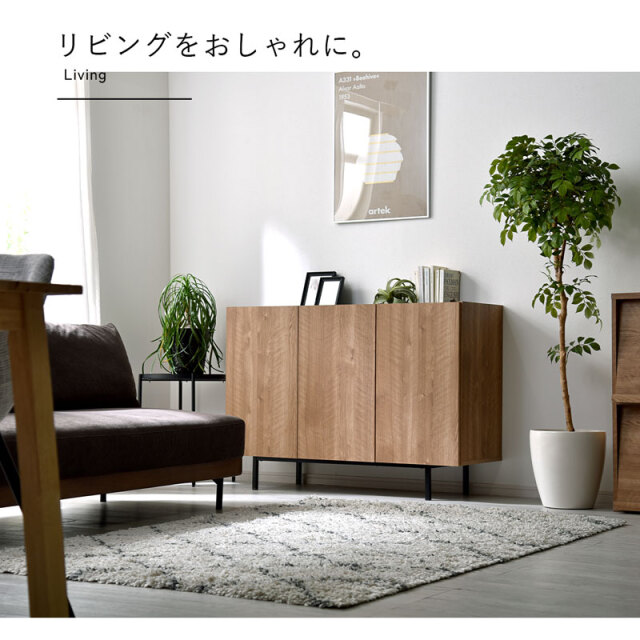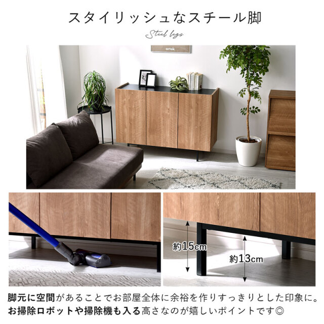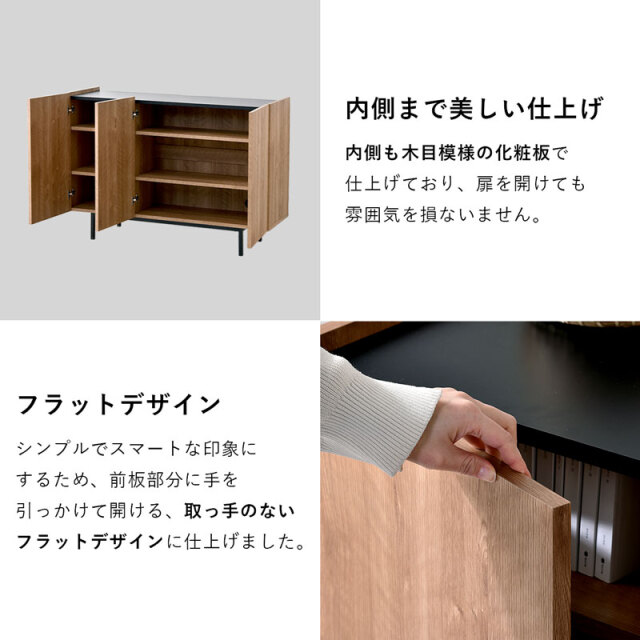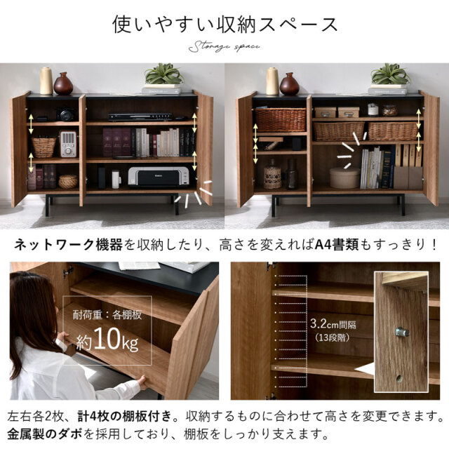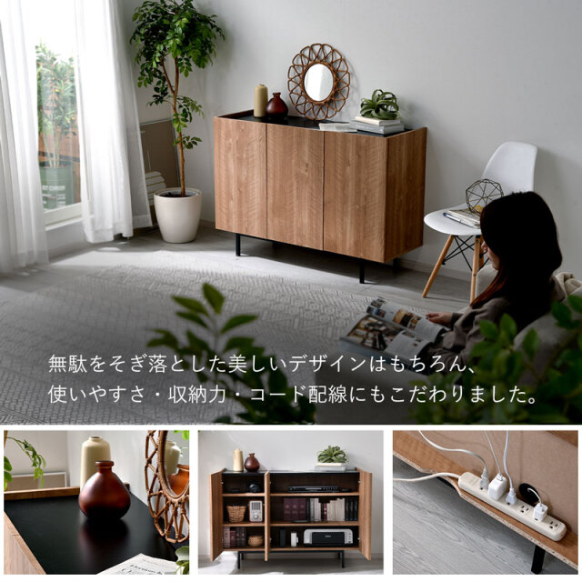 | シンプルで美しいデザインと、こだわりの機能性。 無駄をそぎ落とし、洗練されたフラットデザインにはもちろん、使いやすさ・収納力・コード配線にもこだわりました。 リアルな木目模様を再現した化粧板を本体に使用。 柔らかくあたたかな色味と、美しい木目模様が魅力です。 使いやすい収納スペースは計4枚の棚板付きで、収納するものにあわせて高さを変更できるため、ネットワーク機器やA4書類も収納可能です! 金属製のダボを採用しているため、棚板をしっかり支えてくれます。 すっきり配線できる背面スペースもポイントです。 電源タップをすっきり収納できるスペースを確保しており、コード穴付きのため家電製品も収納可能です。 棚板奥に少しのスペースがあるため、上の段までコードを通せます◎ 空間を引き締めるブラックの天板もコードスリット付きのため、家電製品を置いても壁にぴったり付けられます。 お気に入りの小物を飾るスペースにも◎ 脚部にはスタイリッシュなスチール脚を採用。 脚元に空間があることでお部屋全体に余裕を作り、すっきりとした印象に。 お掃除ロボットや掃除機も入る高さなのが嬉しいポイントです。 リビングボードやテレビ台として、寝室や玄関収納としても大活躍まちがいなしです! | |
