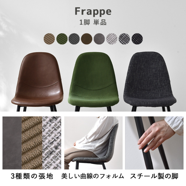 | 豊富なカラーと張地、スチール製の脚と洗練されたシルエットが特徴のダイニングチェア【Frappe(フラッペ)】。 張地は平織り生地、コーデュロイ生地、PUレザーの3タイプから選べます。 心地よさの秘密は、絶妙に身体にフィットするチェアの曲線と、柔らかすぎない程よく硬めの座面。 適度な反発力で体を支え、長時間快適に座ることができますよ。 また、座面高はデスクやダイニング、どちらでも使用できる設計になっております。 耐荷重は100kgとしっかりあり、頑丈な構造。 組み立て方法は脚と座面を固定するだけで、複雑な作業が無いのも嬉しいポイントです。 1脚単品と、同カラーの2脚セットの2バリエーションからお選びいただけます。 ※こちらは1脚単品の販売ページです | |