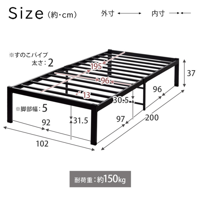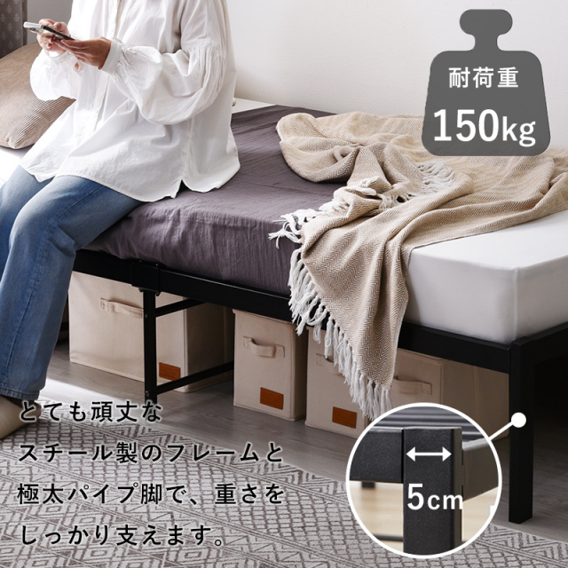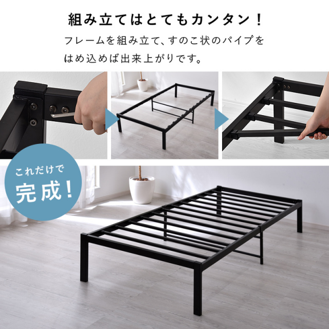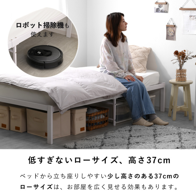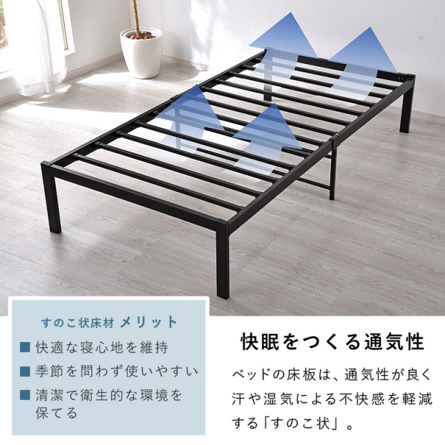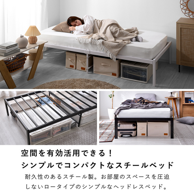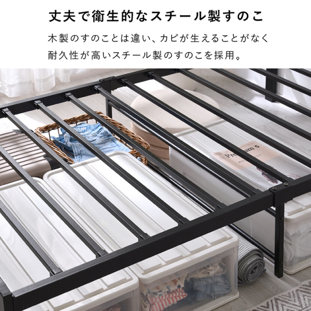 | このスチールベッドは、シンプルでコンパクトなデザインが特徴です。 高さ37cmのロータイプなので、立ち座りがしやすく、お部屋を広く見せる効果もあります。ベッド下の広いスペースは収納場所として活用でき、お掃除も簡単です。 耐荷重150kgと頑丈。スチール製のフレームとパイプ脚部がしっかり支えます。 通気性に優れたスチール製のすのこ状床材を採用しており、汗や湿気による不快感を軽減し、清潔で衛生的な環境を保ちます。 またヘッドレスデザインはホコリがたまりにくく、部屋に統一感を与えます。設置の自由度が高く、お部屋のコーディネートも自在です。 フレームには段差付きでマットレスのズレを防ぎます。これにより、快適な眠りを提供します。 組み立ても非常に簡単で、フレームを組み立て、すのこ状のパイプをはめ込むだけで完成します。 | |