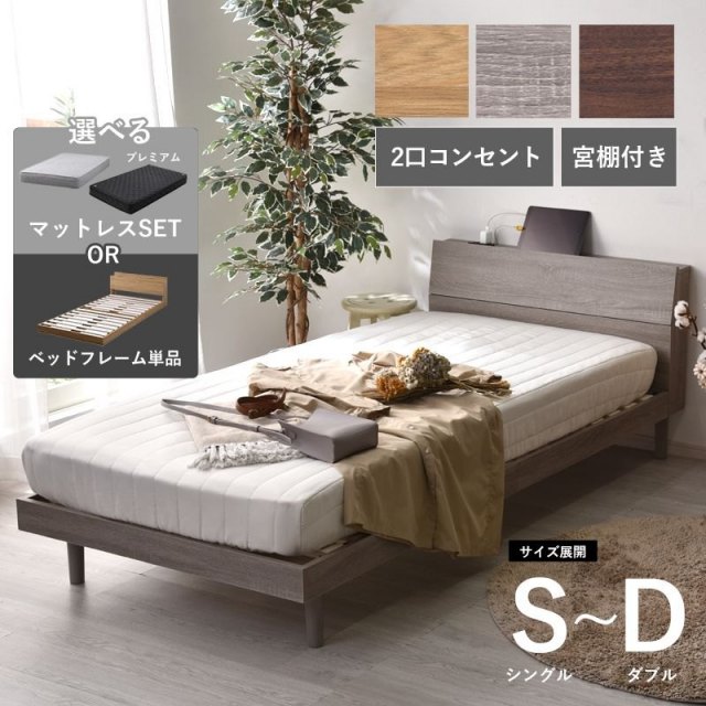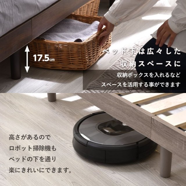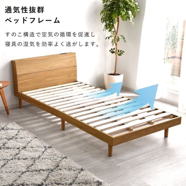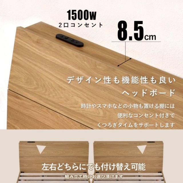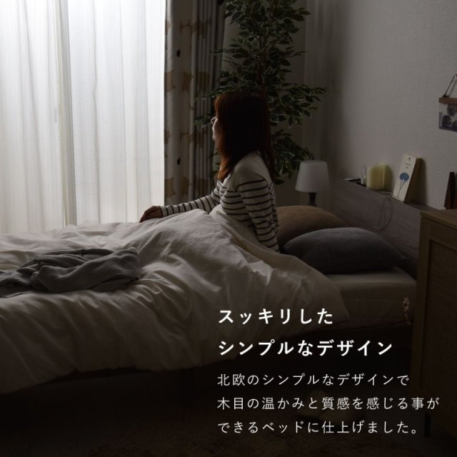 | スッキリしたシンプルなデザイン 北欧のシンプルなデザインで木目の温かみと 質感を感じる事ができるベッドに仕上げました。 おしゃれな質感の表面塗装 艶を抑えたマットなメラミン塗装で保護されており 高級感がある美しい外見となっています 傷にも強く安心して使えます デザイン性も機能性も良いヘッドボード 時計やスマホなどの小物を置ける棚には 便利なコンセント付きでくつろぎタイムをサポートします 通気性抜群ベッドフレーム すのこ構造で空気の循環を促進し 寝具の湿気を効率よく逃がします 部屋を広く感じさせるロースタイルベッドとして使用も 視覚的に圧迫感が少なくワンルームや 小さめの部屋におすすめです ベッド下は広々した収納スペースに 収納ボックスを入れるなど スペースを活用することができます 高さもあるのでロボット掃除機もベッドの下を通り 楽にきれいにできます。 ベッド下の広々した収納スペースにより シーズンオフの衣類や寝具、日常の小物まで整理整頓できます 十字に入ってるフレームすのこ部分も天然木を使用し 安心して快適にご使用頂けます。 身体をしっかり支える強度設計 安心して眠るためにベッドの強度は非常に重要 丈夫なフレーム脚で身体とマットレスを 支えるゆとりのある耐荷重200kg | |