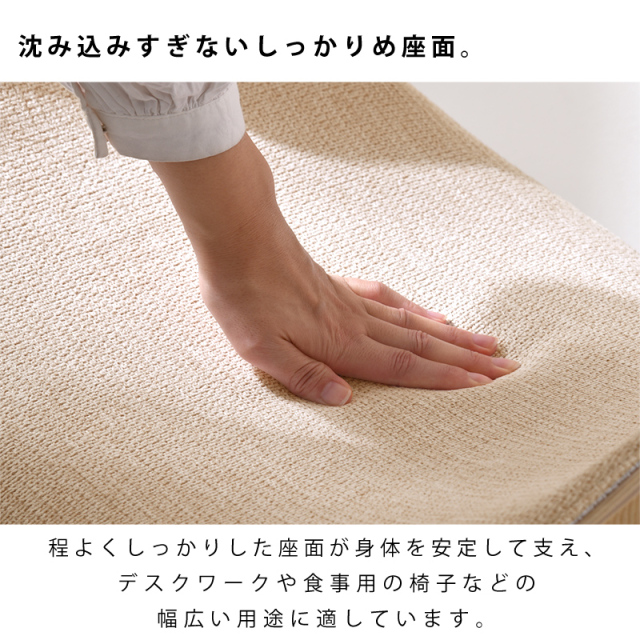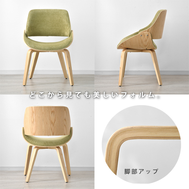 | 高度な技術で木材を曲げる「曲木加工」により、温かみのある柔らかな曲線を描くチェアを完成させました。 どこから見ても美しいフォルムで、ゆるやかなウェーブが身体を包み込むようにフィット。 快適な座り心地を実現します。 背もたれと座面の前面はファブリックの張地。 温かみを感じるラフな感触の織生地で、オールシーズン使用できる生地感です。 張地以外の部分は木目調。 リアルな自然の風合いを再現しており、お部屋に柔らかさプラスします。 座面高は男女ともに座りやすい高さ。 ダイニングにもデスクにも、マルチに使いやすいサイズ感です。 | |