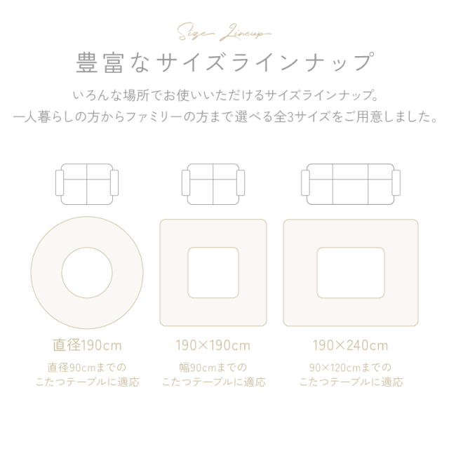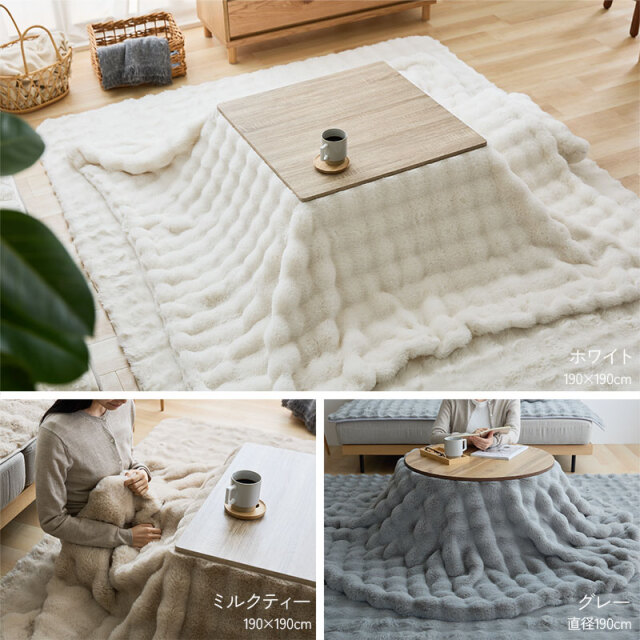 | 取扱タイプ | 190×190/ミルクティー、190×190/ホワイト(白)、190×240/ミルクティー、190×240/ホワイト(白)、190×190/グレー、190×240/グレー、直径190/ミルクティー、直径190/ホワイト(白)、直径190/グレー |
