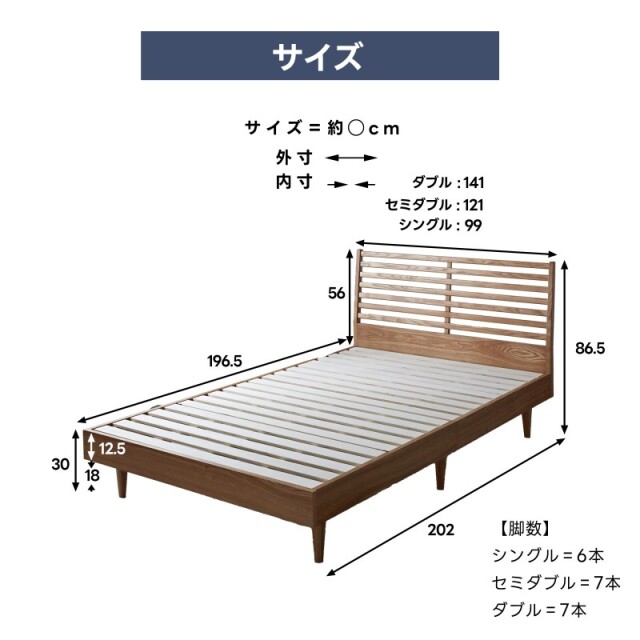 | 商品サイズ | 【フレーム】 シングル:(約)幅99cm×奥行き205.5cm×高さ87cm セミダブル:(約)幅121cm×奥行き205.5cm×高さ87cm ダブル:(約)幅141cm×奥行き205.5cm×高さ87cm 【ノーマルマットレス】 シングル:(約)幅97cm×奥行き195cm×高さ15cm セミダブル:(約)幅120cm×奥行き195cm×高さ15cm ダブル:(約)幅140cm×奥行き195cm×高さ15cm 【プレミアムマットレス】 シングル:(約)幅97cm×奥行き195cm×高さ20cm セミダブル:(約)幅120cm×奥行き195cm×高さ20cm ダブル:(約)幅140cm×奥行き195cm×高さ20cm |
