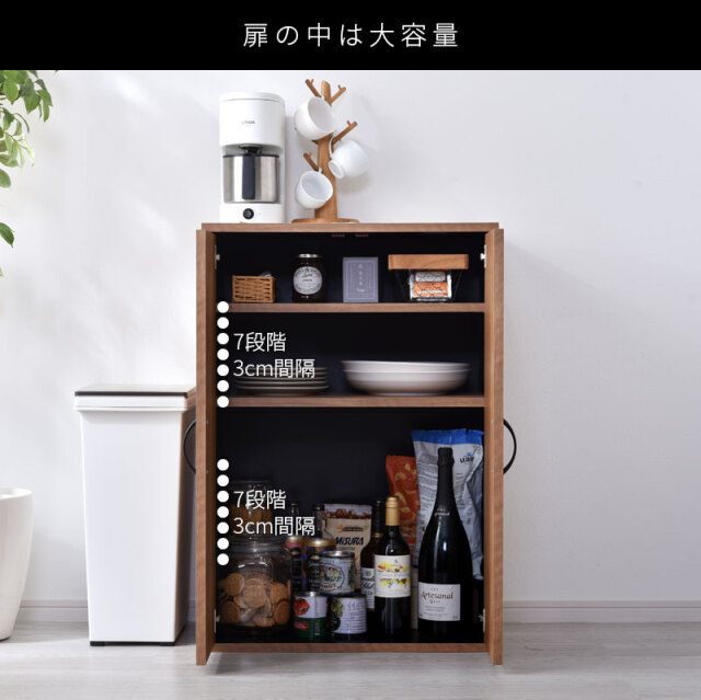 | 生活感は扉で隠して天板には小物を飾れる設計になっており、木目扉を黒ハンドルが引き締め、すっきりと空間に馴染みます。 扉内は可動棚で高さ調整。本や小物も収納にも使いやすい作りです。 収納物のサイズに合わせて可動棚で高さ調節ができるのでお部屋をオシャレで快適に整理整頓できます。 合計14段階の高さ調節ができるので使い勝手抜群です。 シンプルなデザインの木製扉収納なのでキッチンに設置してお使い頂く他にもリビングに設置して小物や書籍の収納にもお使い頂く事ができます。 | |