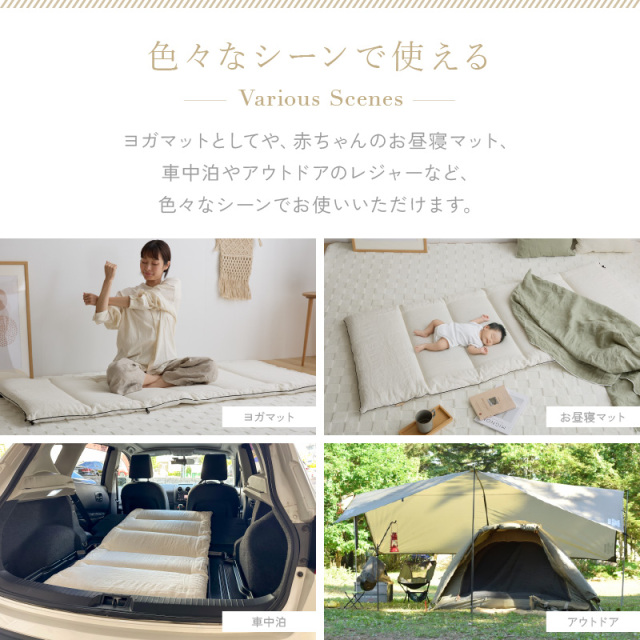 | Hinari(ヒナリ)のごろ寝マットは、リネン100%のさらりとした肌ざわりとナチュラルな風合いが魅力。 縁には丁寧なパイピング仕上げを施し、シンプルながらも上品で洗練された印象に仕上げています。 程よい厚みとやわらかな使い心地で、リビングや和室でのくつろぎ時間にぴったりです。 お昼寝用のマットとしてはもちろん、ヨガやストレッチ、赤ちゃんのお昼寝やキッズのプレイマットとしても活躍。 アウトドアや車中泊など、持ち運んで使えるのも嬉しいポイントです。 天然素材ならではの心地よさは、使うほどにくったりと馴染み、日々の暮らしにやさしく寄り添います。 | |