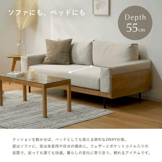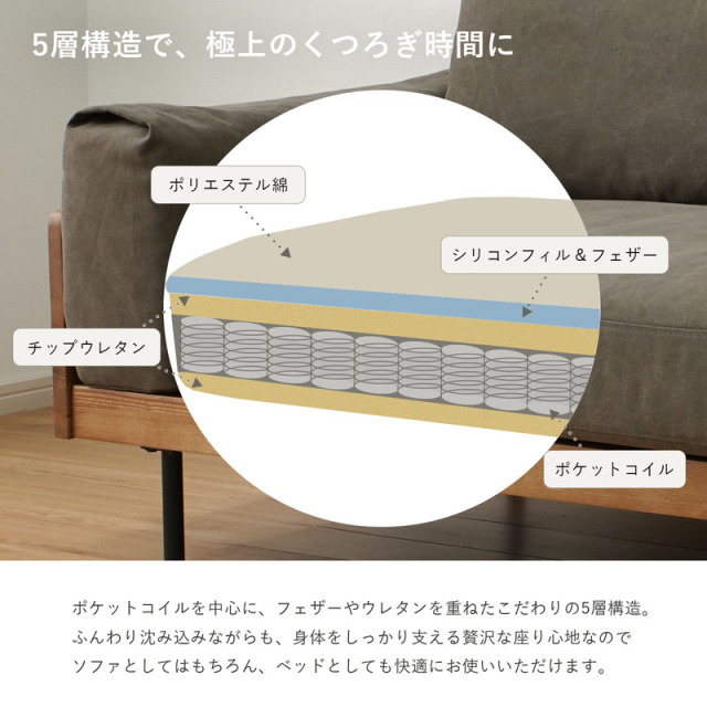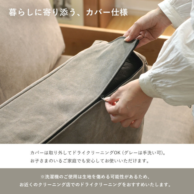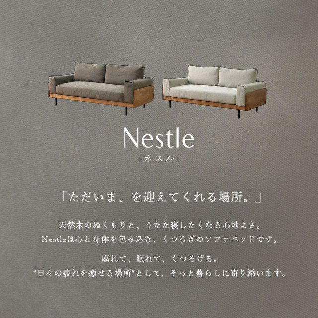 | Nestle(ネスル) “ただいま”を迎えてくれる、やさしいくつろぎの場所。 天然木のぬくもりと、フェザー×シリコンフィルのふんわりとした柔らかさ。 しっかりと体を支えるポケットコイル入りの座面は、座っても寝ても心地よく、 クッションを動かせばベッドとしても使える2WAY仕様。 180cmのゆったり幅で、大人2~3人がくつろげるサイズ感。 ナチュラルで洗練された佇まいは、背面まで美しく、どこから見ても絵になる仕上がりです。 カバーは取り外してクリーニング可能。毎日の暮らしに寄り添いながら、帰るたびに、ほっと気持ちが安らぐようなアイテムです。 | |