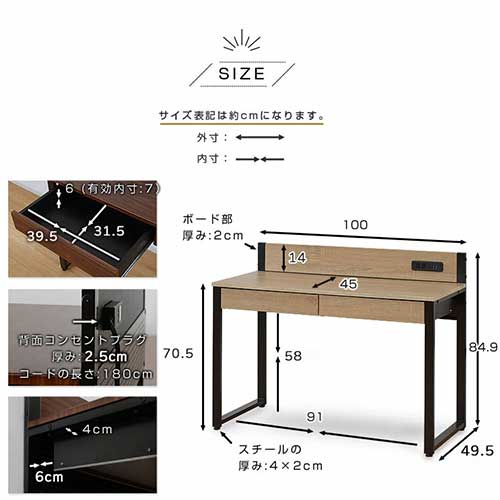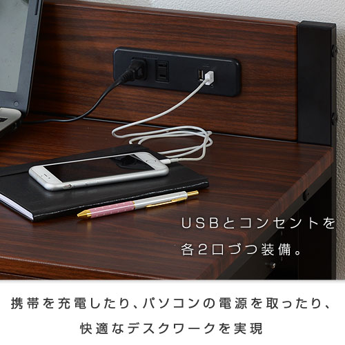 | 美しく使いやすくを追求したデザインデスクが登場です。 自然の温もりを感じる美しい木目模様にブラックスチールを合わせ、USBとコンセントが2口ずつ付いた、実用性とデザイン性が際立つデザインデスクの登場です。 天板は幅110×奥行45cmで作業しやすく、スリムでどんな場所にも置きやすい計算されたサイズ。 美しい木目模様と、存在感のある太いブラックスチールとのコントラストが秀逸なスタイリッシュデザイン。 このデスクの特徴は何と言ってもUSBとコンセント。 「ここにあったら良いな」を実現した、快適なデスクワークを貴方に届けます。 お洒落なデザインに隠された耐久性を計算されたコダワリ。 枠組み脚で強度を高め、バックボードが美しく耐久性を高めます。 さらに天板のサイドにはクリップやクランプ式のデスクライトやモニターアームをが付けれて使い勝手が広がります。 大きな引出しが2つ付いているので収納もOK。 北欧やミッドセンチュリー、男前家具などで揃えたお部屋にもオシャレにフィット。 美しい見た目と機能性が揃った、オフィスから勉強机まで幅広く使える本格的なデスクです。 | |