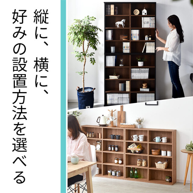 | 少年コミック、青年コミック、DVD、CDを無駄なく収納可能。 まるで書店や図書館の様に美しく整理整頓ができる、お部屋を圧迫しないコミックの収納に調度良い奥行の本棚が登場です。 分割して、それぞれ個別に使用できる様にデザインされています。 横一列に並べてロータイプ本棚としてや、1つはリビングに、もう1つは子供部屋にという風に別々のお部屋でお使い頂く事ができます。 | |