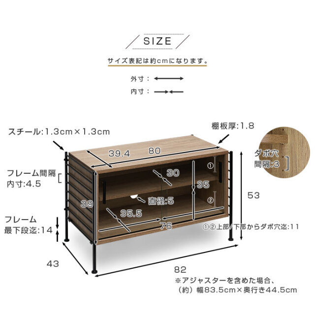 | 商品サイズ | キャビネット:(約)幅80cm×奥行き39.4cm×高さ39cm フレーム:(約)幅82cm×奥行き43cm×高さ53cm ※アジャスターを含めた場合、(約)幅83.5cm×奥行き44.5cm |