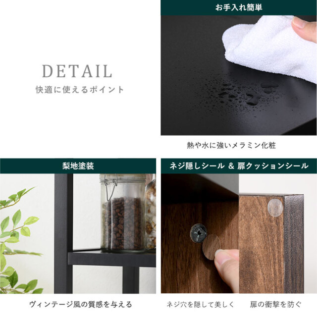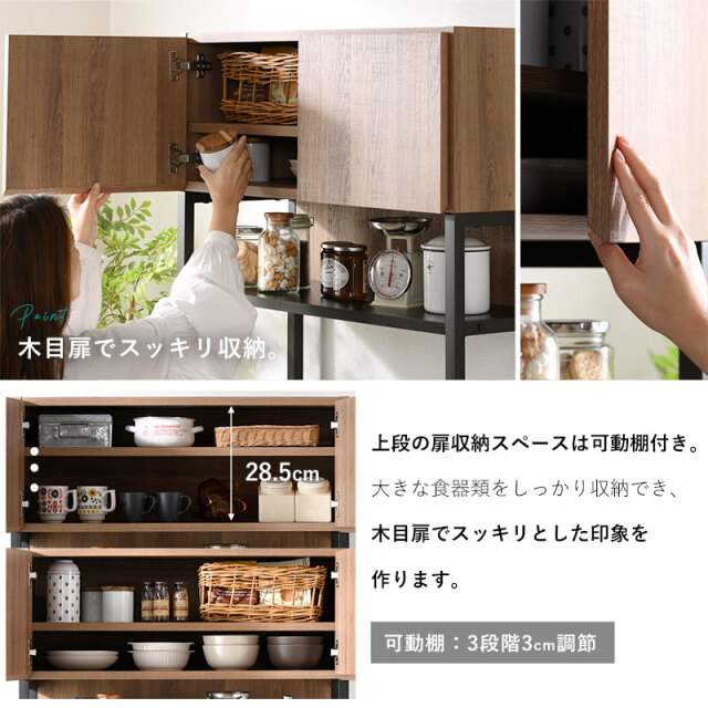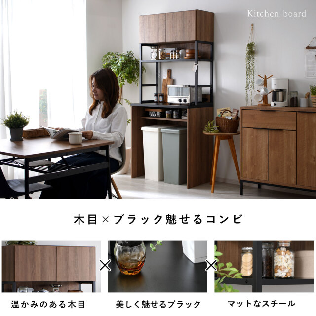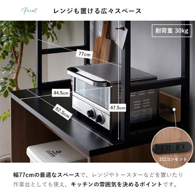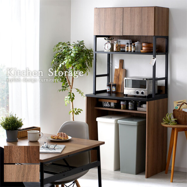 | 憧れのキッチンを実現する、新しいキッチン収納ラックが登場です。 ゴミ箱上のデッドスペースを有効活用し、大量の食器や家電を収納できるこの食器棚は、美しい木目模様とブラックのコントラストが特徴です。職人技が光る逸品で、スチールと木の異素材のコンビネーションに加え、棚など細部に「黒」を取り入れたデザインは必見です。 「キッチンが狭くて、収納家具を置けない」「新たな収納スペースを増やしたいけれど、キッチンが狭くなるのはイヤ」といった悩みを解決する収納力抜群のゴミ箱上ラックやレンジ台として、キッチンで大活躍間違いなしです。 さらに、2口コンセントが設置されており、見た目も機能性も兼ね備えた商品です。 | |