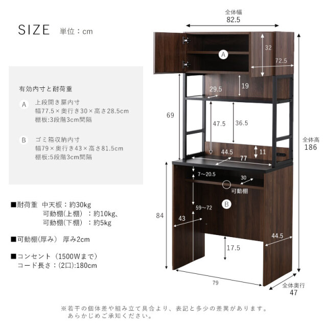 | 耐荷重 | 中天板:(約)30kg 可動棚(下台):(約)10kg 可動棚(上棚):(約)5kg |