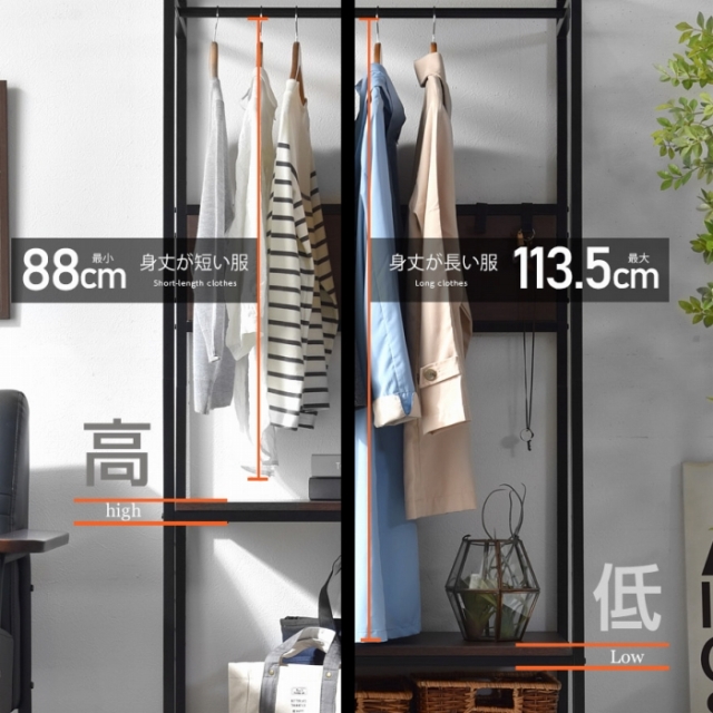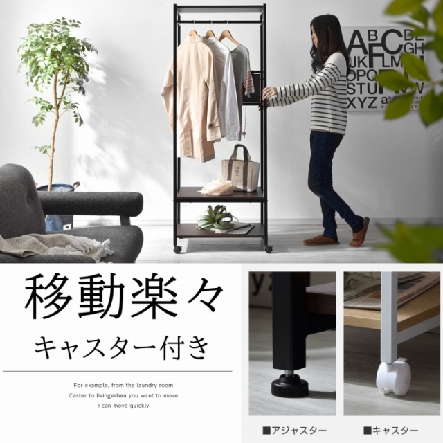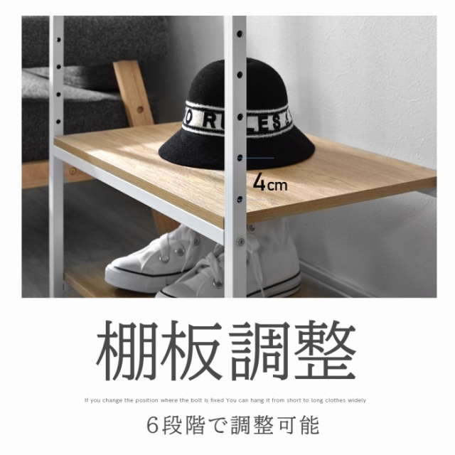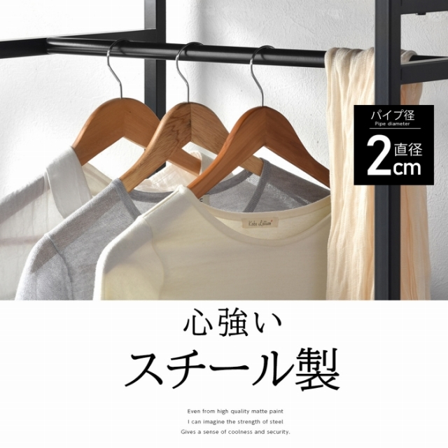 | かっこよくシンプル、それでいて機能的 そんな贅沢をこのハンガーラック1台解決します。 質感の高いマットな塗装でかっこよくシンプルな印象 棚板は6段の高さ調整ができるので ハンガーに掛けるものの サイズに応じて高さ調整をして頂けます。 フック式のハンガーが2つ付属しており お好みにあわせて背板にひっかけて頂くことが可能です。 足元はアジャスター式とキャスター式の どちらかをお好みにあわせて 選んでいただけます。 | |
