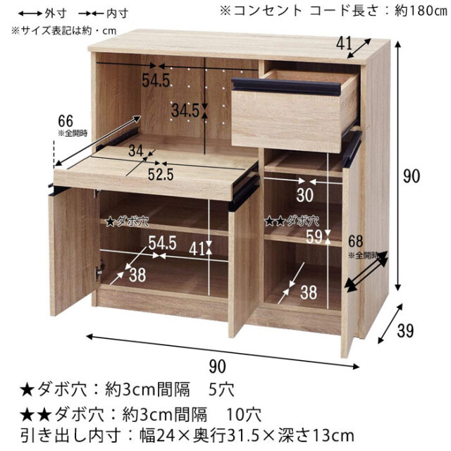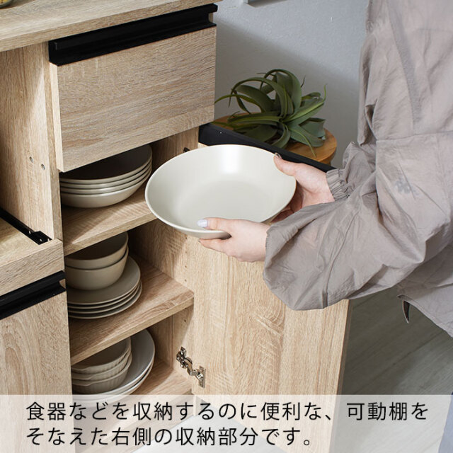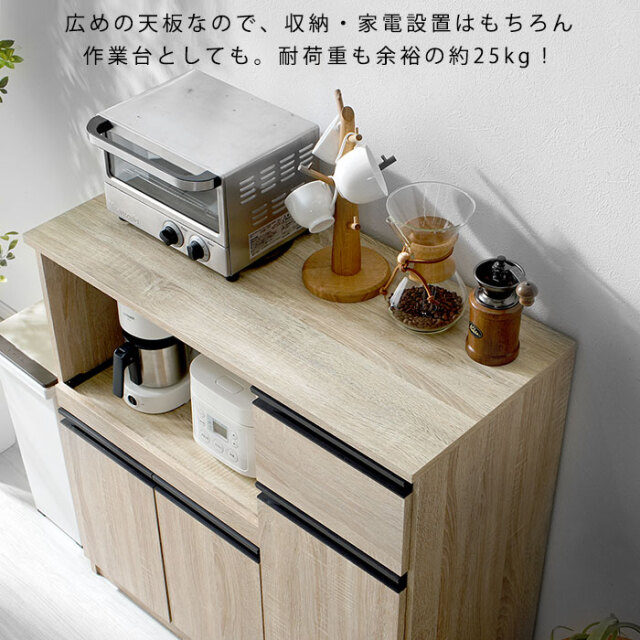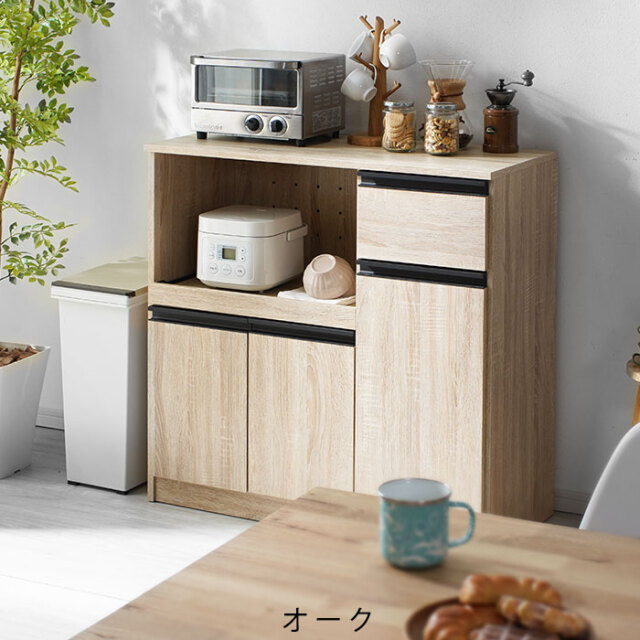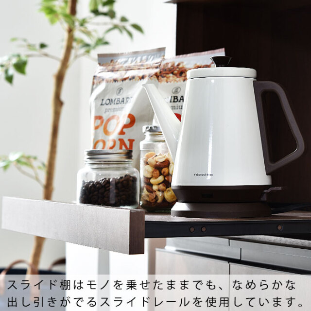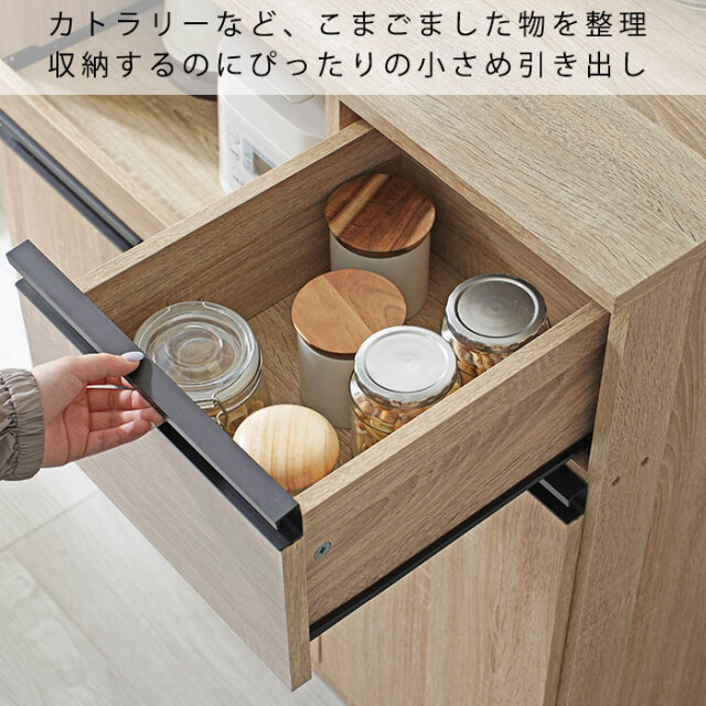 | 暮らしに少し豊かさを加える理想のロータイプ型のキッチン収納です。食器などの収納に便利な棚部分や引き出し部分に加え、スライド棚や2口コンセントを備えた、家電を使う際に便利な収納部分をそなえた「キッチンの収納」に特化した、便利な家電収納です。 左下には大き目の開き扉の収納ラック。棚は可動式で収納するものの高さで調整が可能です。幅が広いので大きなお鍋やホットプレートも余裕で片付けておくことができます。右側には食器棚として使えるタテ型の収納箇所。こちらの棚も可動式で、細かい整理ができます。 引き出しはお箸やスプーンなどカトラリー収納に便利です。 左上のオープンラックになっている家電収納部分は、熱がこもらないよう背板は空気孔付き。さらにスライドラックになっているので手前に引き出して蒸気を逃がしたり手元で作業ができます。 合計1500Wの2口コンセントと、スライドラックがついて家電の使用も便利になります。 | |