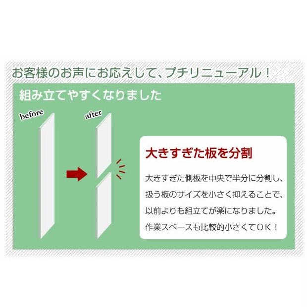 | 商品仕様 | 前板:塩ビ化粧繊維板 その他:プリント化粧繊維板 表面加工: 鏡面仕上げ 背面化粧仕上げ |