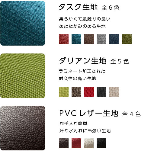 | 商品仕様 | 構造材:スチールパイプ クッション材:ウレタン モールド成型 脚部:樹脂脚150mm 生地:タスク、ダリアン、PVC |