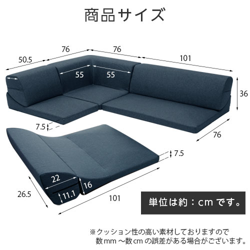 | 商品サイズ | サイズ1P:(約)幅50.5cm x 奥行き76cm x 高さ36cm 座面の高さ:(約)7.5cm サイズ2P:(約)幅101cm x 奥行き76cm x 高さ36cm 座面の高さ:(約)7.5cm サイズコーナー:(約)幅76cm x 奥行き76cm x 高さ36cm 座面の高さ:(約)7.5cm |
