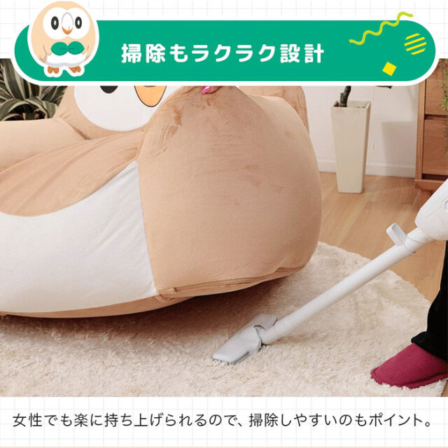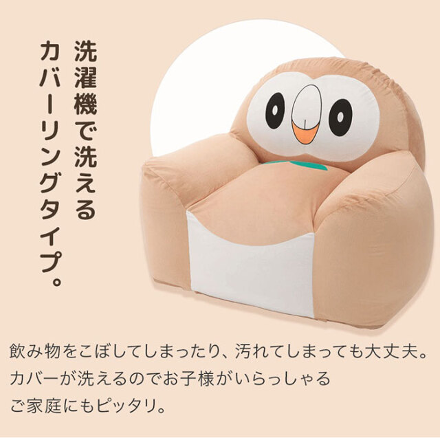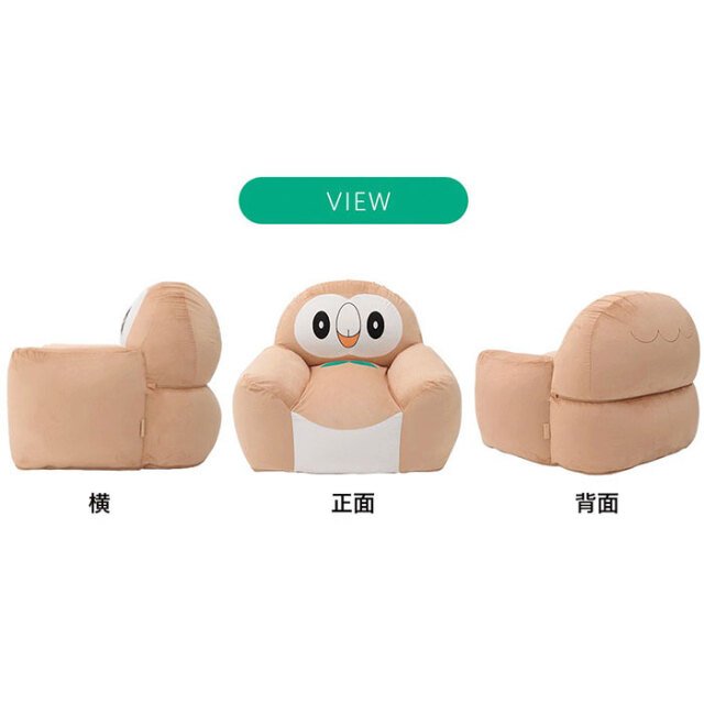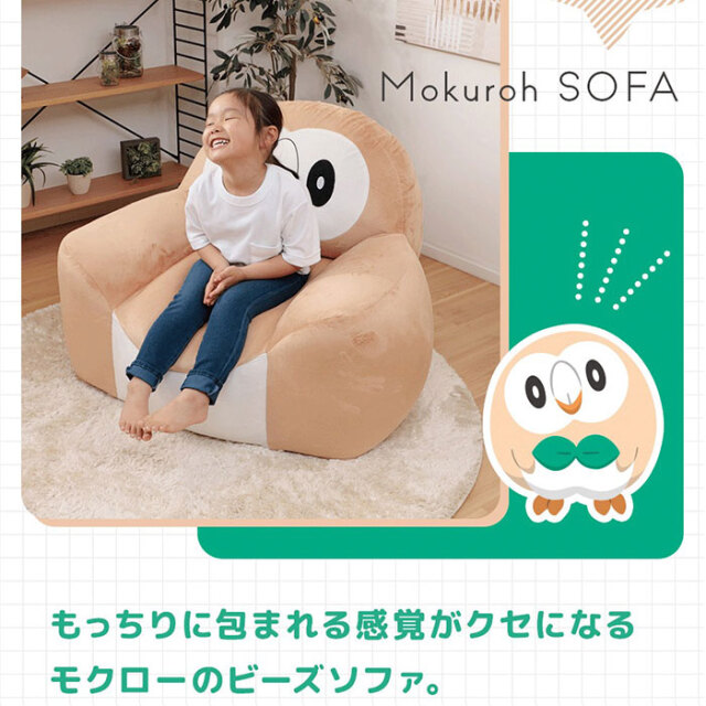| ポケモンの中でも人気の高いモクローがソファになりました。 気が付いたら包まれているビーズソファ。体へのフィット感だけではなく座っているときの安定感も抜群に。背もたれとひじ掛けも付いているのでからだ全体を預けてゆったりとリラックス。長時間座っていてもストレスなく、快適にリラックスできます。 くさばねポケモンのモクローのソファのこだわりポイント!下くちばしには生地刺繍を入れました。また胸のかわいい模様もプリントされています。 背もたれの裏側は後頭部のかわいい毛も再現しています。 ウレタンと極小ビーズが程よくちょうどよく配合されて誕生した「スゴビーズ」を中材として使用。体のフィット感と座ったときの安定性もバツグン!底つき感のないしっかりとした座面は身体を包み込んでくれます。 また、女性も楽に持ち上げられる軽量で掃除もしやすいところがポイント。 もっちり感のある座り心地のポケットモンスターのモクローのソファは背もたれ・ひじ掛けでリラックス感アップ。 ご家庭の洗濯機でカバーを洗うことができます。 | |