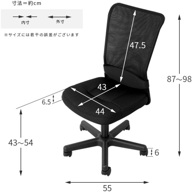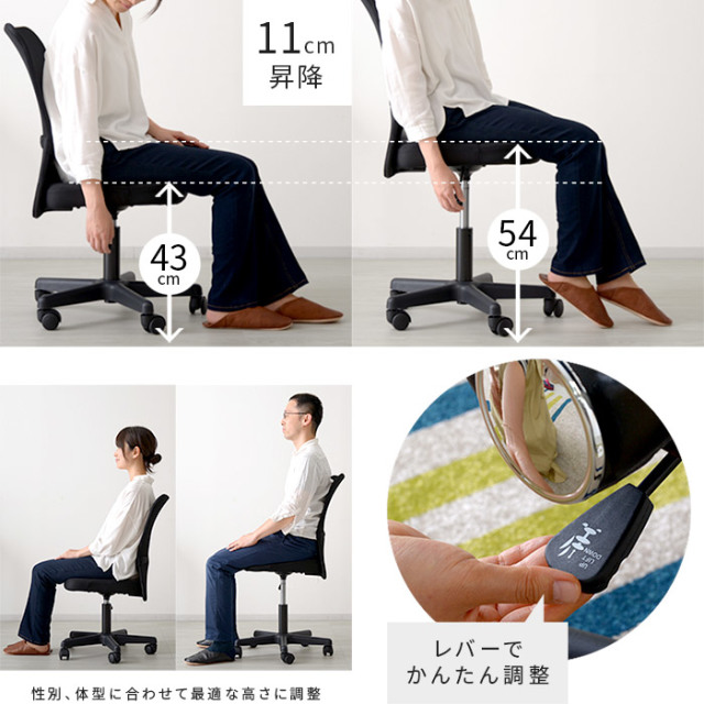| 商品仕様 | 本体:ポリエステル(メッシュ)/ナイロン/ウレタンフォーム ガス圧昇降式 ランバーサポート付 |