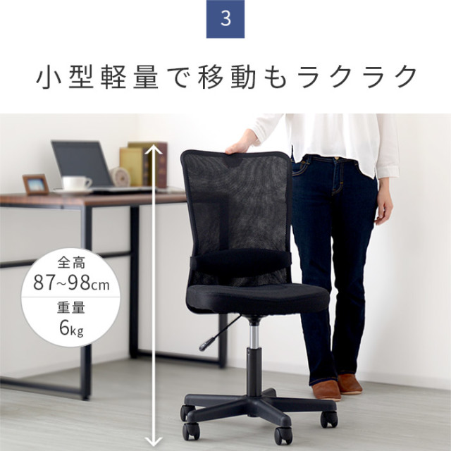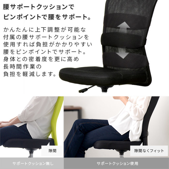 | 毎日座るオフィスチェアに必要な快適性と機能性を追求したチェア。 1年中快適な通気性抜群のメッシュ生地を採用。 長時間の使用でも疲れにくい、立体構造座面はお尻の位置をしっかりホールド。 背もたれは背中にぴったりフィット。 更に、調整可能な付属の腰サポートクッションがピンポイントで腰をサポート。 上下昇降機能付きなので、身長や机に合わせて最適な高さに調整。 小型軽量なので、女性でもかんたんに移動可能。 360度回転しますので、作業効率もUP。 ブラック(黒)、オレンジ(オレンジ)、グリーン(緑)の3色をラインナップ。 | |