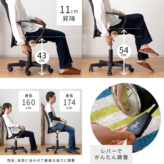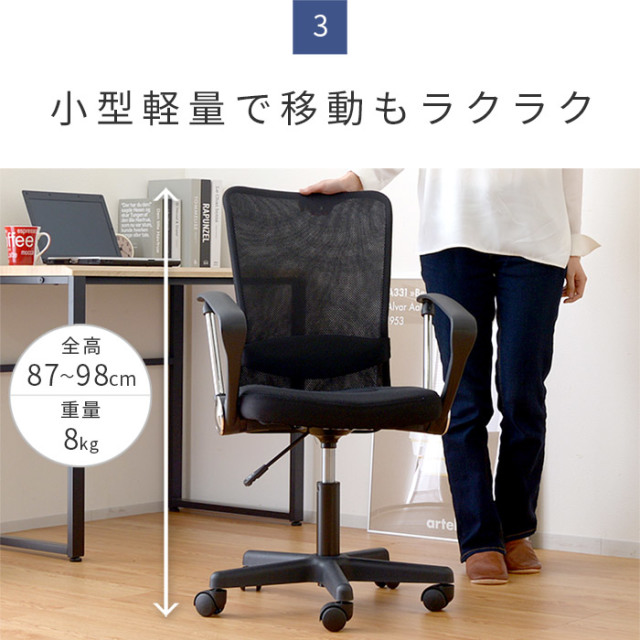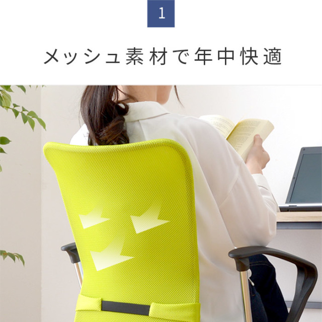 | 毎日座るオフィスチェアに必要な快適性と機能性を追求したチェア。 1年中快適な通気性抜群のメッシュ生地を採用。 長時間の使用でも疲れにくい、立体構造座面はお尻の位置をしっかりホールド。 背もたれは背中にぴったりフィット。 更に、調整可能な付属の腰サポートクッションがピンポイントで腰をサポート。 アームレスト付きでリラックス。取り外せば低いデスクにもすっきり収まります。 上下昇降機能付きなので、身長や机に合わせて最適な高さに調整。 小型軽量なので、女性でもかんたんに移動可能。 360度回転しますので、作業効率もUP。 ブラック(黒)、オレンジ(オレンジ)、グリーン(緑)の3色をラインナップ。 | |