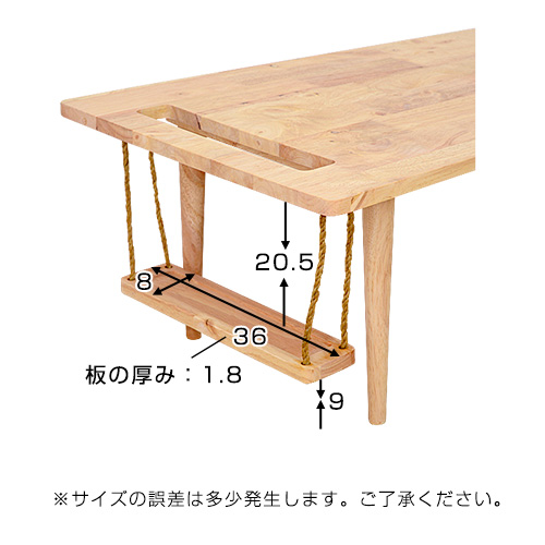 | 上質な天然素材に「遊びゴコロ」収納をプラスしたおしゃれなデザインテーブル。 片端に、釣り下がったブランコが付いているインテリア性の高いセンターテーブルです。 ゆらゆら揺れる縄付きブランコは雑誌や新聞を収納して、マガジンラックとして使用するのにピッタリです。本以外にもお気に入りの雑貨をのせて、ディスプレイを楽しむこともできます。 材質にはナチュラルな木のぬくもりを活かした天然木ラバーウッドを使用しております。素朴な木目、やさしいカラーでお部屋に馴染んでくれます。天然木の無垢材を組み合わせた天板はつい触りたくなるあたたかみがあります。1台1台違う表情をお楽しみいただけるのも天然木ならではの醍醐味です。 脚も天然木を使用し、丸みのあるやさしいフォルムとなっております。 天板の隅の刻印がアクセント。 横幅約120cmのワイドサイズだから、資料を広げながらパソコンをしたり、ご飯を食べたり色んなシーンで使えるテーブルです。 シンプルデザインだから、ナチュラルやカジュアル、北欧テイストのお部屋にもピッタリ。 一人暮らしのお部屋からファミリーで使うリビング、子供部屋まで幅広くお使いいただけます。 | |