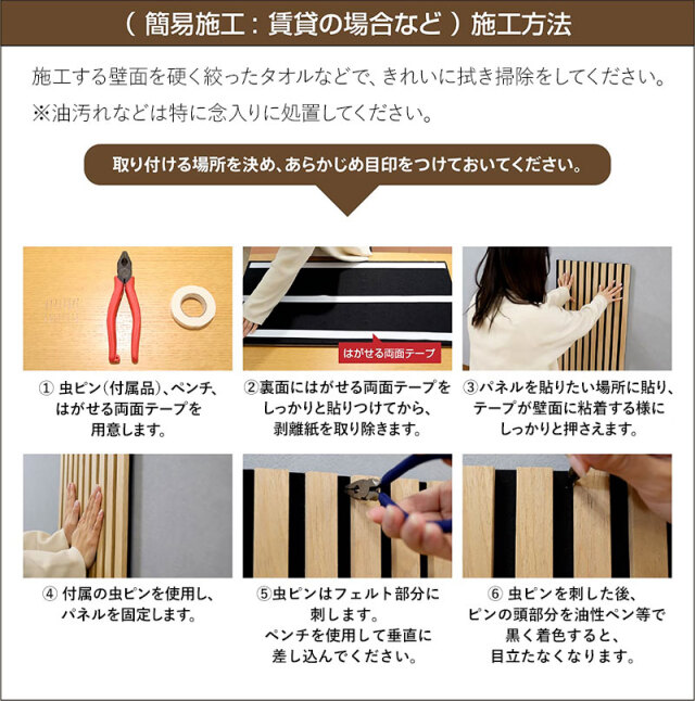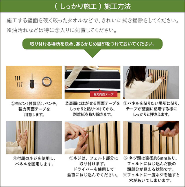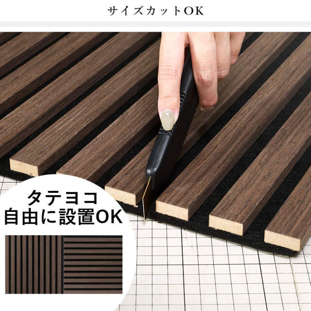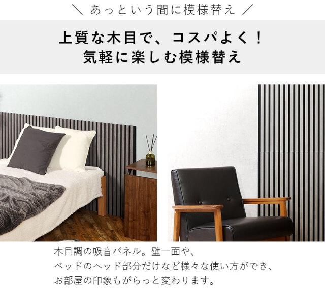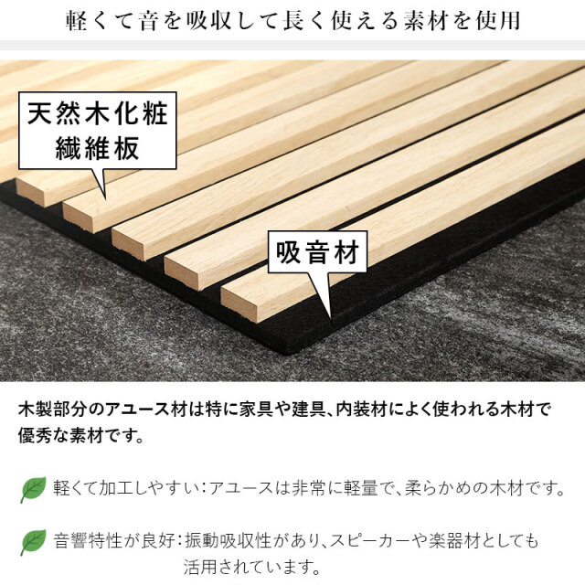 | 一般的に単色の吸音パネルが多い中、天然木を使ったデザイン性と機能性を兼ね備えたおしゃれな吸音パネルです。 ポリエステルファイバー層の無数の空気孔が音を吸収します。 壁に貼るだけで簡単に防音対策が可能。 賃貸など原状回復したい場合は剥がせる両面テープや画鋲を、しっかり固定したい場合は接着剤を使うなど用途に合わせてDIY可能。 木目調の吸音パネル。壁一面や、ベッドのヘッド部分だけなど様々な使い方ができ、お部屋の印象もがらっと変わります。 | |