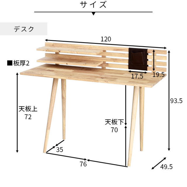 | 商品サイズ | デスク:(約)幅120cm×奥行き49.5cm×高さ93.5cm スツール:(約)幅50cm×奥行き33cm×高さ44.5cm |