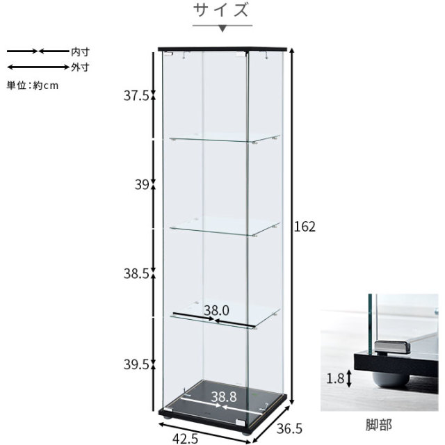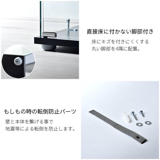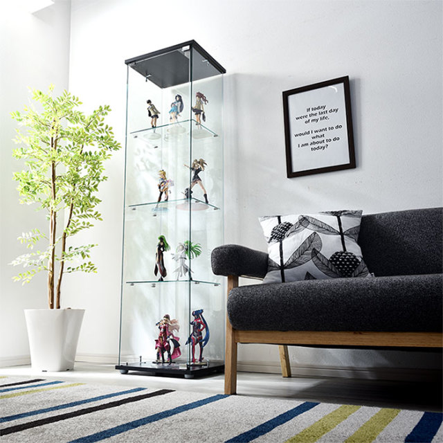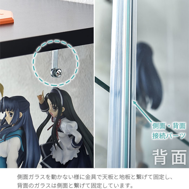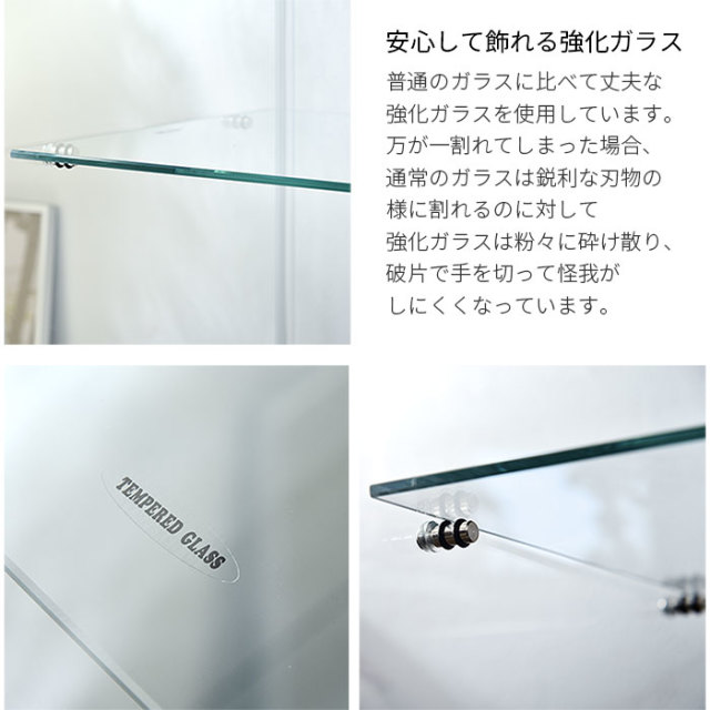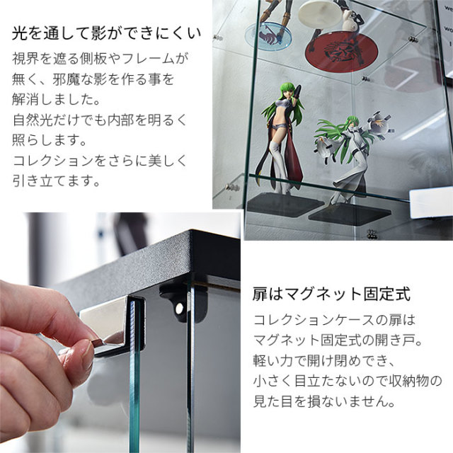 | お気に入りのコレクションや思い出の品をディスプレイしながら収納できるガラスケースです。 4面ガラス張りに加え、棚板も全段ガラスでコレクションを引き立てます。 お気に入りのフィギュアやアクセサリーなどを見てもらう為、眺める為に余計な装飾が無く、どの角度からでもお気に入りが目に入るこのコレクションケースがオススメです。 側面ガラスを動かない様に金具で天板と地板と繋げて固定し、背面のガラスは側面と繋げて固定した視界を遮らないノン・フレーム構造になっています。 | |
