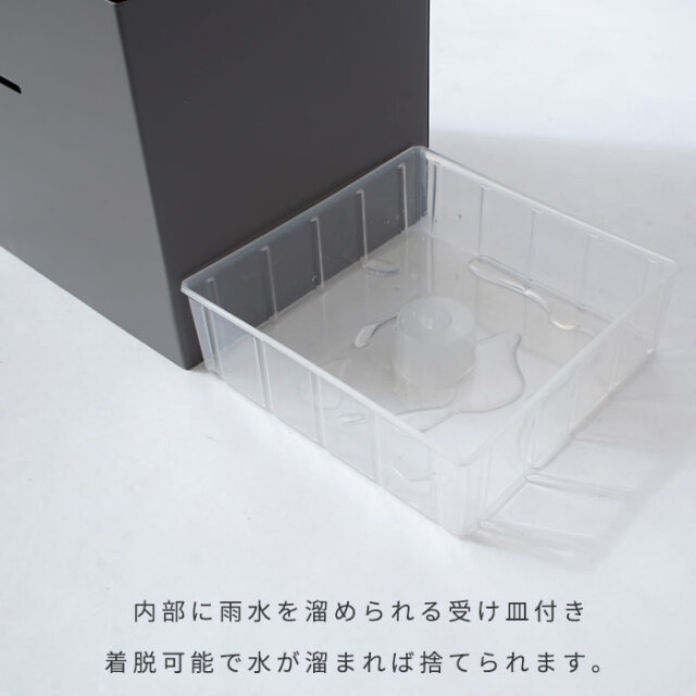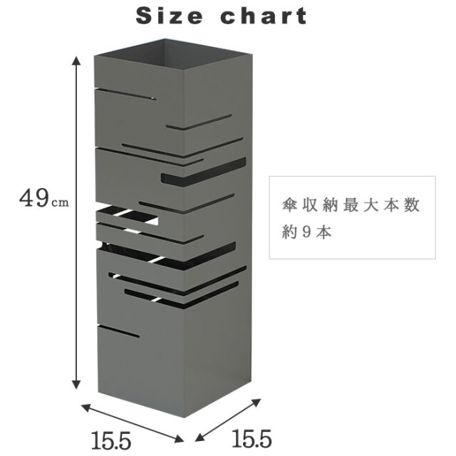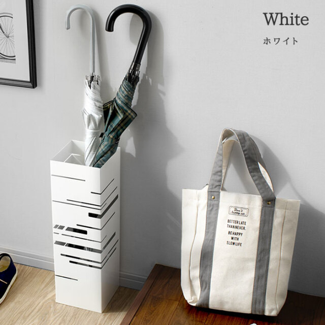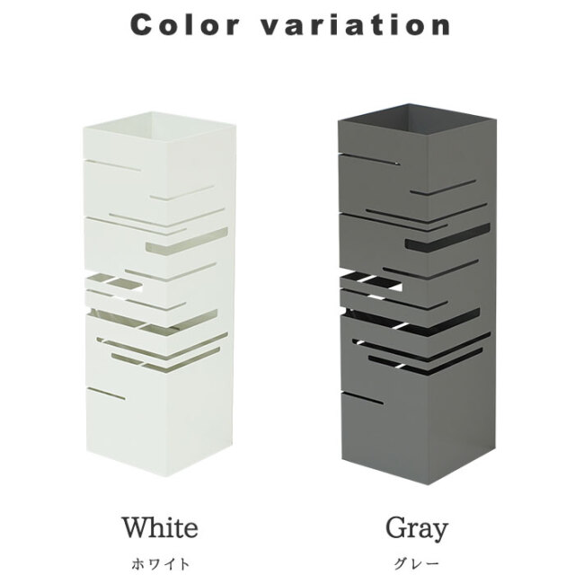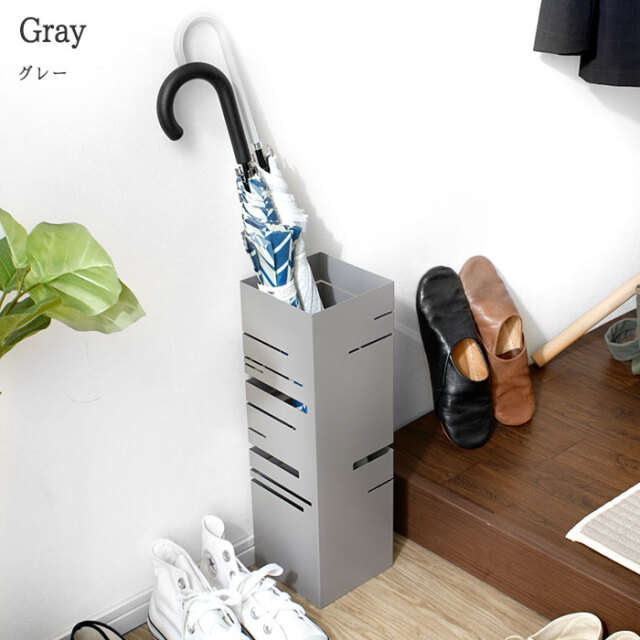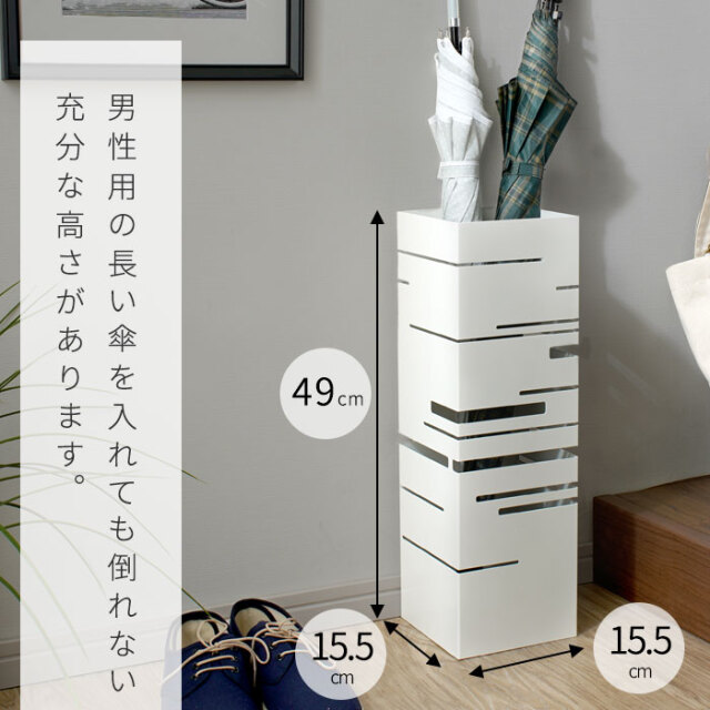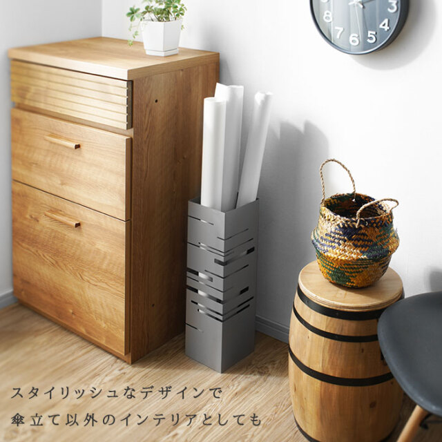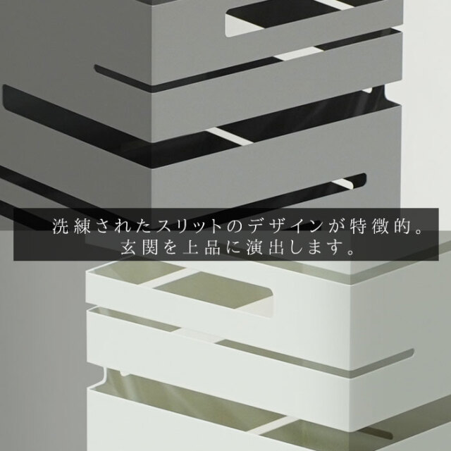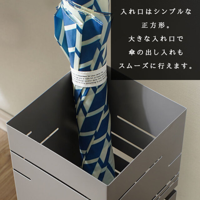 | シンプルな姿のなかに光るスリットのもようが美しい傘立て。 どんな玄関にもフィットする四角形です。 限られた玄関のスペースにも置きやすいコンパクトサイズ 大人の傘もしっかりと収納できる高さも安心です。 取り外しが可能な受け皿付き。雨水がたまればすてることが可能です。 | |