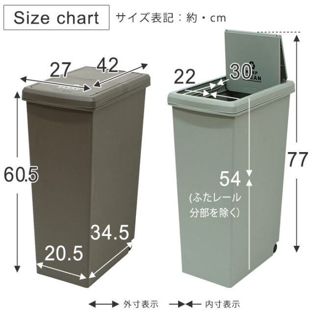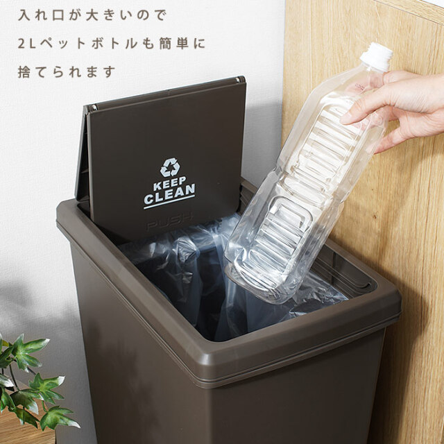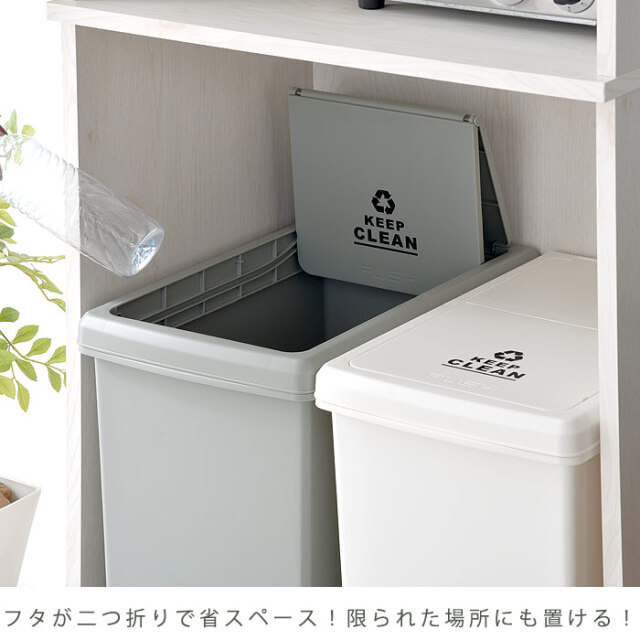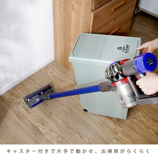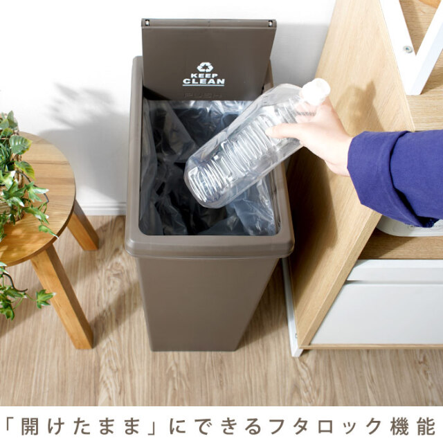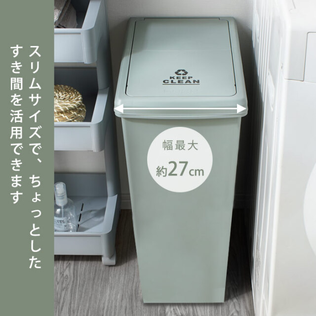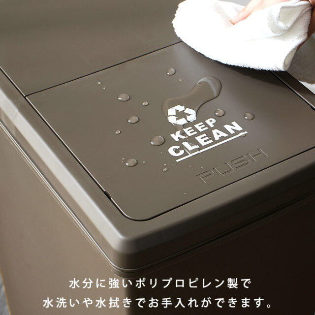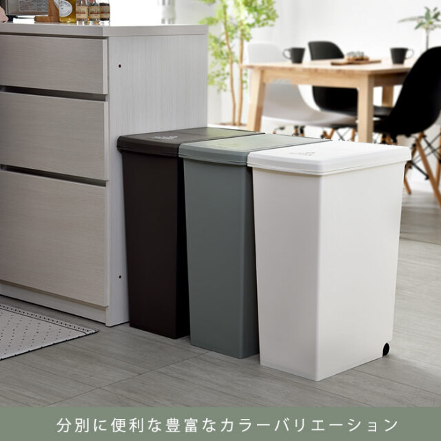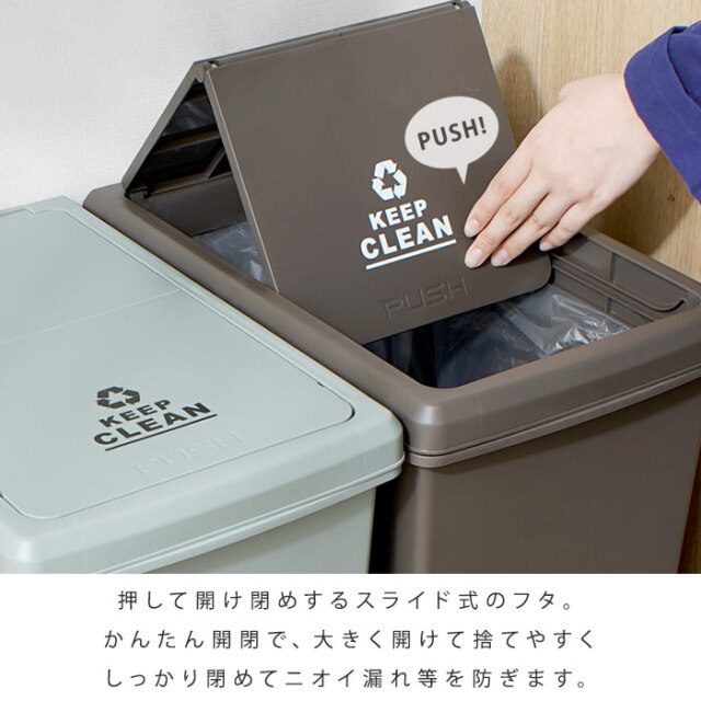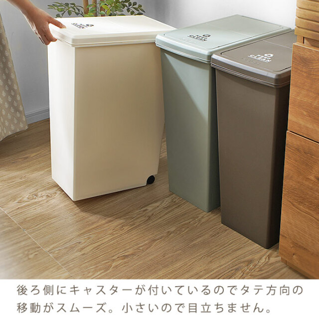 | 大容量と省スペース。2つを兼ね備えたキャスター付きスライドペールです。 安心・信頼の日本製。MADE IN JAPANのクオリティは使うとわかる便利さが満載。 お部屋に相性のよいツヤ消し・スモーキーカラーでおしゃれなゴミ箱は、スライド式のフタ付き。指でプッシュするだけでかんたんに開閉して、大きな入れ口で大きなゴミも余裕で捨てられます。フタはロックもできて開けっ放しにもできます。 しっかりフタも閉められて、におい漏れを軽減します。 二つ折りのフタなので、高さが限られる場所でも干渉しづらく、使う場所を問いません。 ゴミ袋留めがついていて、つかっているうちに袋が外れないストレスフリー仕様。外からゴミ袋が見えないのですっきりとした見た目もオススメ。 後方にキャスターがついていて、前後移動がスムーズ。掃除のときなどに大変便利です。 水分に強いポリプロピレン製で、水洗いや水拭きでお手入れができます。 幅がスリムなので、デッドスペース活用ができます。 だからキッチンはもちろん、デスクサイド、トイレ、脱衣所はもちろん、複数使いで分別ダストボックスとしても大変便利です。 | |
