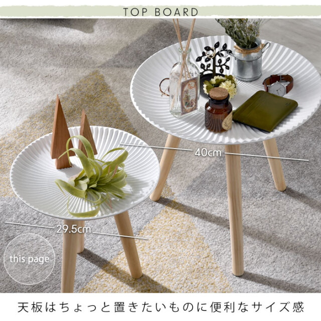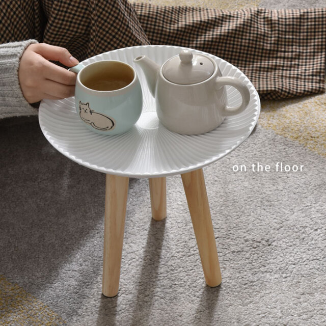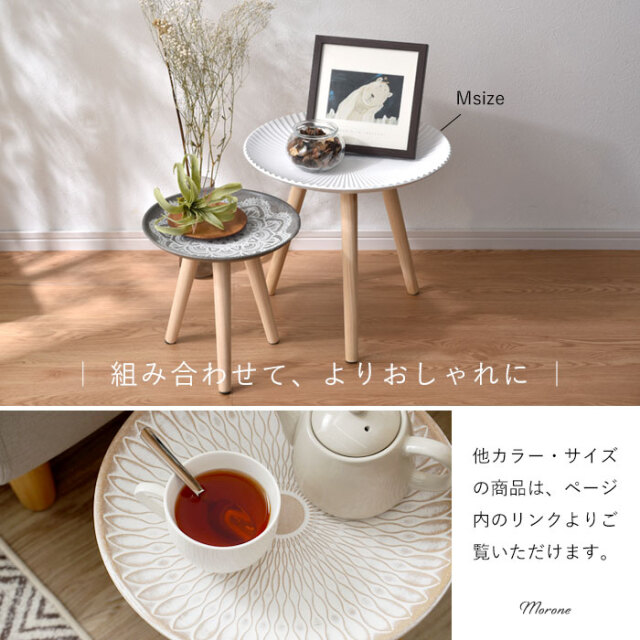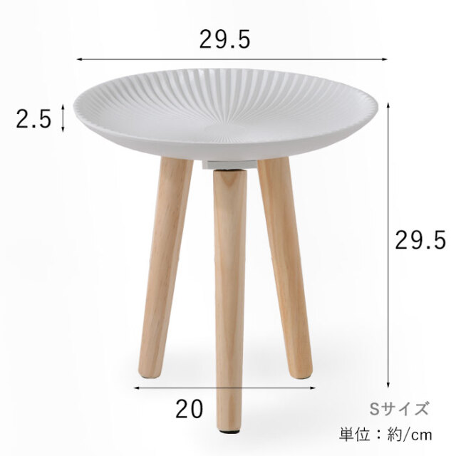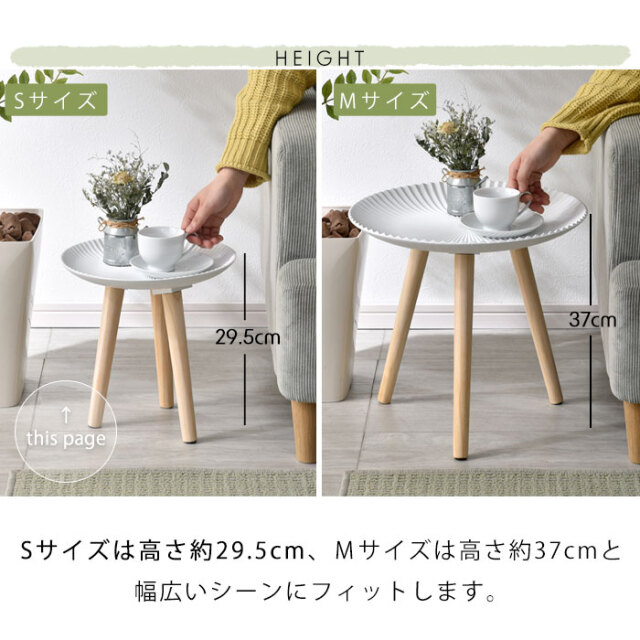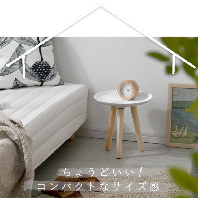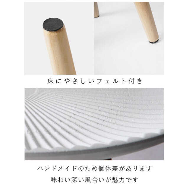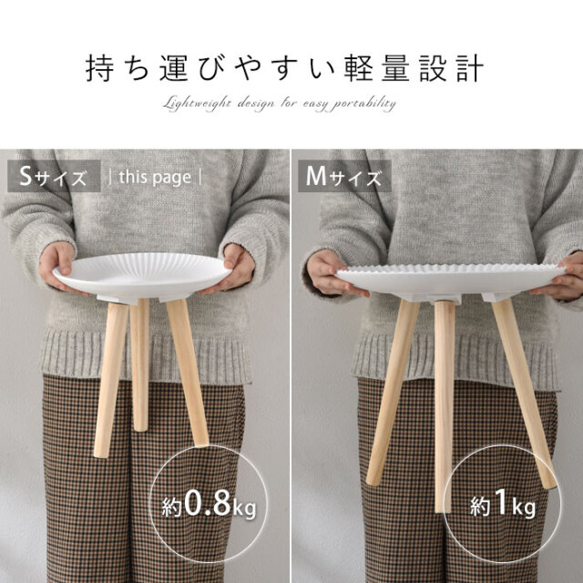 | 北欧テイストがおしゃれ、置くだけで心地よい空間に― お部屋に映えるコンパクトなトレーテーブル。 (こちらはSサイズ/ホワイトの商品ページです) 浜辺にある美しい貝のようなシェルデザインが特徴。純白のカラーに放射状の凹凸が絶妙な陰影を創り出します。 お皿のような曲線的なデザインが華やかさと同時に柔らかな雰囲気を醸し出し、置くものを引き立てます。 脚部にはパイン材を贅沢に使用。天然木の1つ1つ模様の異なる木目が上質な雰囲気を演出します。 リビングでの床使いから、ベッドサイドやソファサイド、玄関まで幅広いシーンで使いやすいサイズ感。フラワースタンドやお部屋のインテリアにもご使用いただけます。 ゆったり置ける天板とちょうどいい高さが使いやすい。 天板は木材の繊維板で出来ているため、Sサイズで約0.8kgと女性の方やお子様でも持ち運びしやすい軽量設計。 お部屋の模様替えやお掃除もラクラクです。 傷防止のフェルトが付属しております為、床を傷つけにくく、安心してお使いいただけます。 こちらの商品は1つ1つ手作業で製造されているため、ハンドメイドならではの天板の擦れ具合の違いが、味わい深い印象を与えます。使う中で生まれる小傷や擦れもそのまま味として表情に取り込まれていくデザインとなっており、経年変化も含めて長くご愛用いただけます。 同シリーズのレース(グレー)/太陽(ベージュ)柄もございますので、ぜひ組み合わせてお楽しみください。 オシャレだけじゃない、使いやすいサイドテーブルで快適に。 | |