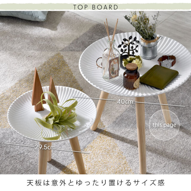 | 北欧テイストがおしゃれ、置くだけで心地よい空間に― お部屋に映えるコンパクトなトレーテーブル。 (こちらはMサイズ/ホワイトの商品ページです) 浜辺にある美しい貝のようなシェルデザインが特徴。純白のカラーに放射状の凹凸が絶妙な陰影を創り出します。 お皿のような曲線的なデザインが華やかさと同時に柔らかな雰囲気を醸し出し、置くものを引き立てます。 脚部にはパイン材を贅沢に使用。天然木の1つ1つ模様の異なる木目が上質な雰囲気を演出します。 リビングでの床使いから、ベッドサイドやソファサイド、玄関まで幅広いシーンで使いやすいサイズ感。フラワースタンドやお部屋のインテリアにもご使用いただけます。 ゆったり置ける天板とちょうどいい高さが使いやすい。 天板は木材の繊維板で出来ているため、Mサイズで約1kgと女性の方やお子様でも持ち運びしやすい軽量設計。 お部屋の模様替えやお掃除もラクラクです。 傷防止のフェルトが付属しております為、床を傷つけにくく、安心してお使いいただけます。 こちらの商品は1つ1つ手作業で製造されているため、ハンドメイドならではの天板の擦れ具合の違いが、味わい深い印象を与えます。使う中で生まれる小傷や擦れもそのまま味として表情に取り込まれていくデザインとなっており、経年変化も含めて長くご愛用いただけます。 同シリーズのレース(グレー)/太陽(ベージュ)柄もございますので、ぜひ組み合わせてお楽しみください。 オシャレだけじゃない、使いやすいサイドテーブルで快適に。 | |