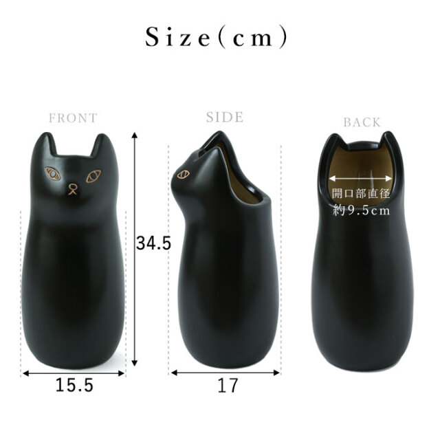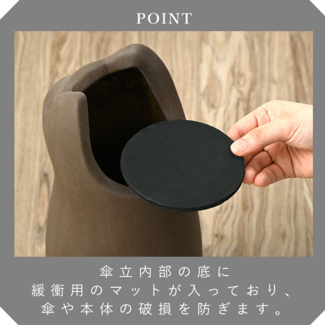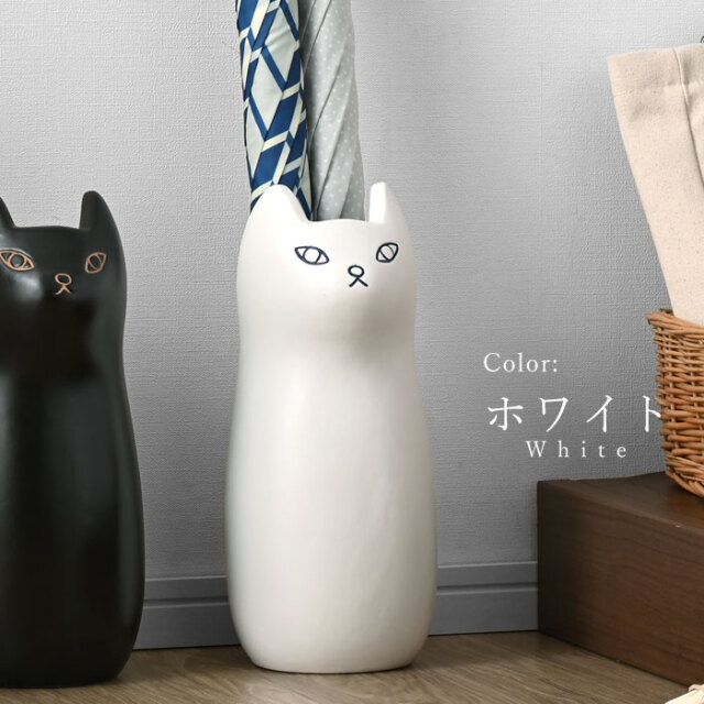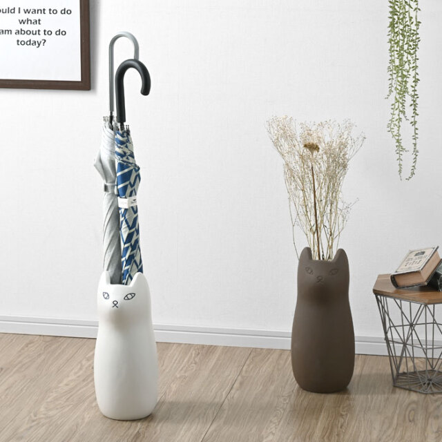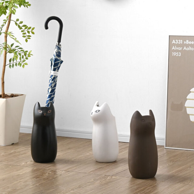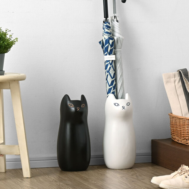 | 陶器製で錆びない。かわいいネコの傘立て「NASCA (ナスカ) 」にミニサイズが登場しました。 きゅっと結んだ口元とぽってりしたフォルムがかわいくて、きっとあなたの家の玄関を彩ること間違いなし。 カラーは3色展開で、ブラックとホワイトは陶器特有のコーティングしたような滑らかな質感。 ブラウンはブラックやホワイトと違い、あえて素焼きにして少しざらついたナチュラルな風合いに仕上げております。 最大約3本の傘を収納でき、スリムな15.5cm幅で狭いスペースに置けることから、一人暮らしの方にもおすすめのアイテムです。 また、傘立ての内部には緩衝用のマットが入っていますので、本体や傘の破損を防いでくれます。 シンプルな色はインテリアにも馴染むので、花瓶やポスターの収納としてもお使いできますよ。 | |