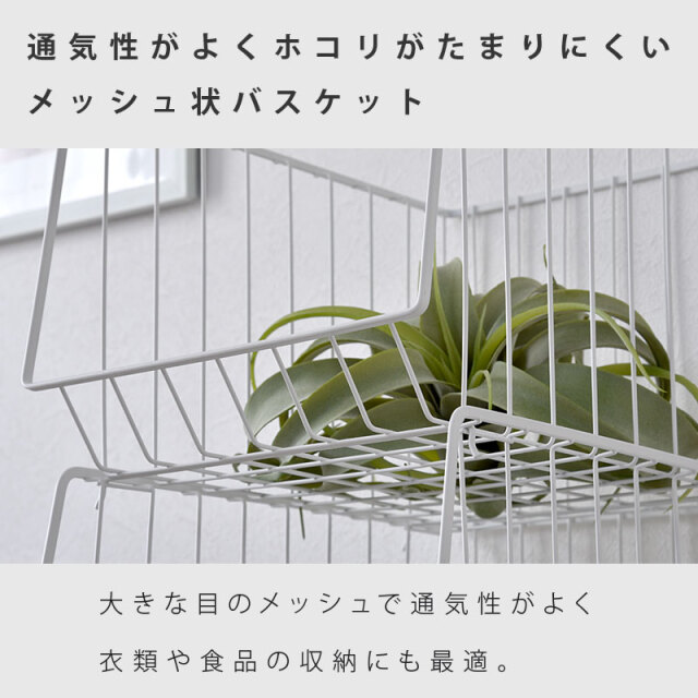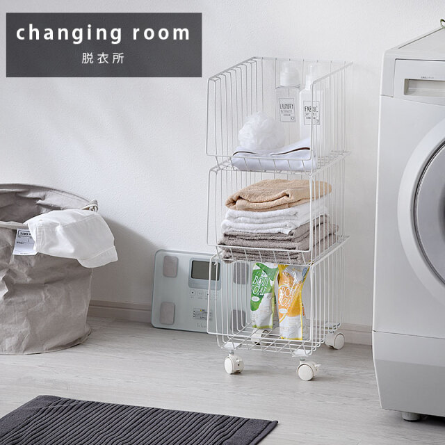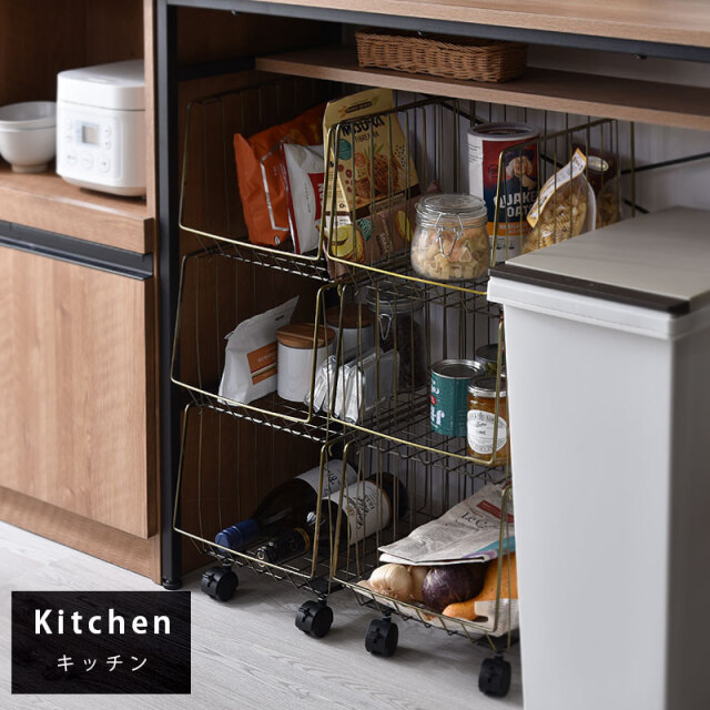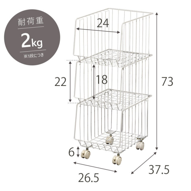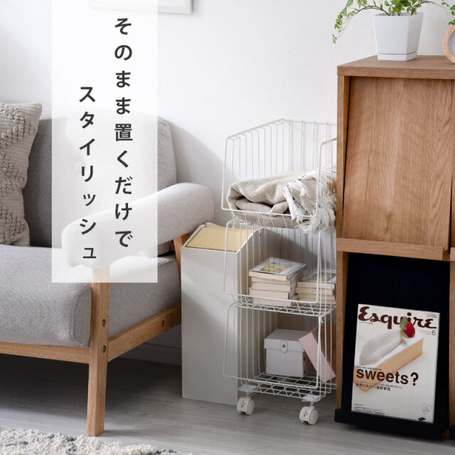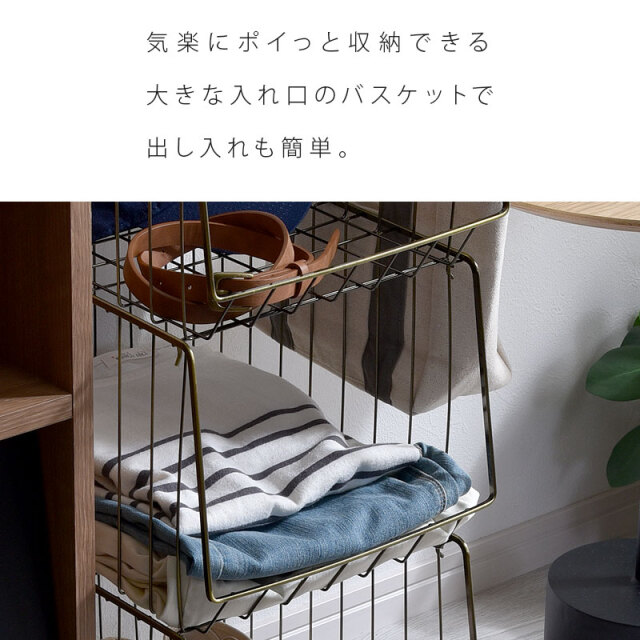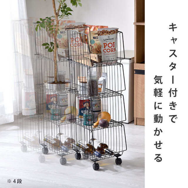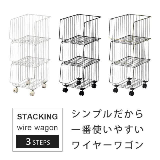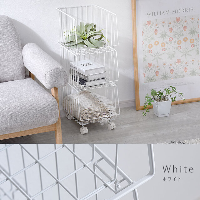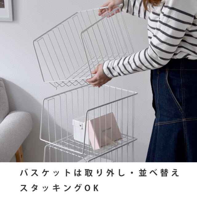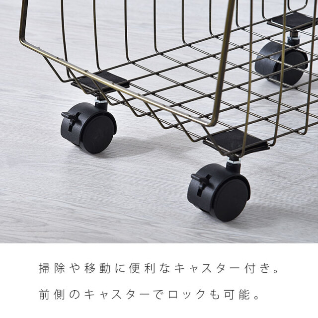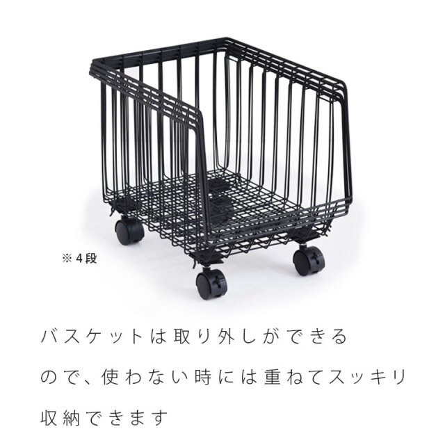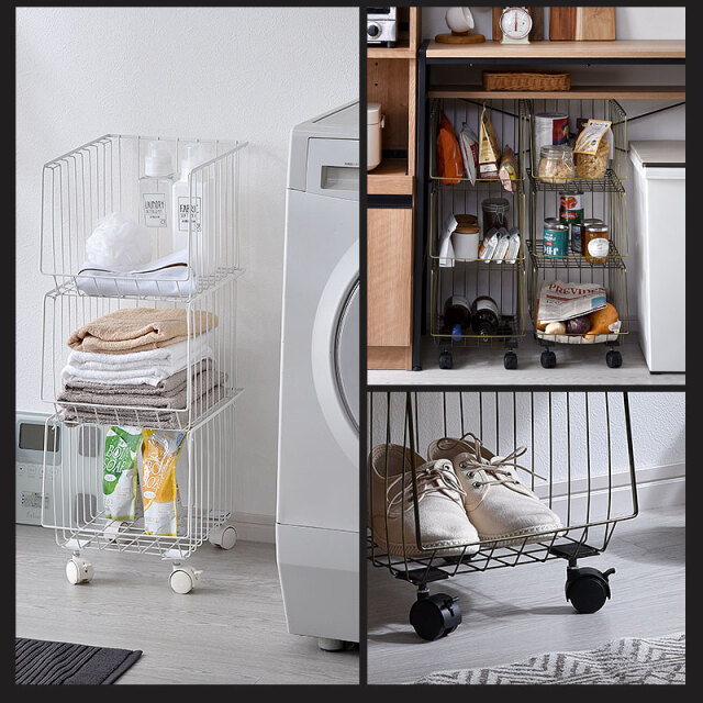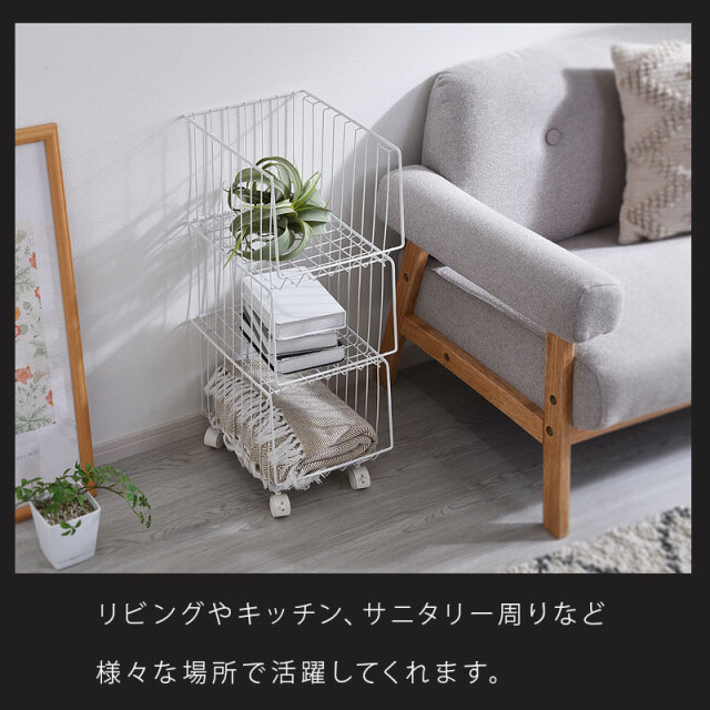 | シンプルだから一番使いやすいスタッキングワイヤーワゴン。 スチール製のバスケットはリビングやキッチン、サニタリー周りなど様々な場所で活躍してくれます。 気楽にポイっと収納できる大きな入れ口のバスケットで出し入れも簡単。 掃除や移動に便利なキャスター付き。前側のキャスターでロックも可能。 通気性がよくホコリがたまりにくいメッシュ状バスケット。大きな目のメッシュで通気性がよく衣類や食品の収納にも最適。 バスケットは取り外しができるので、使わない時には重ねてスッキリ収納できます。 さらに幅27cmの幅ですき間を活用できます | |