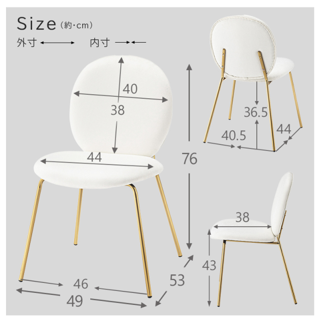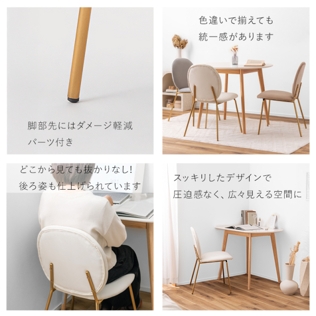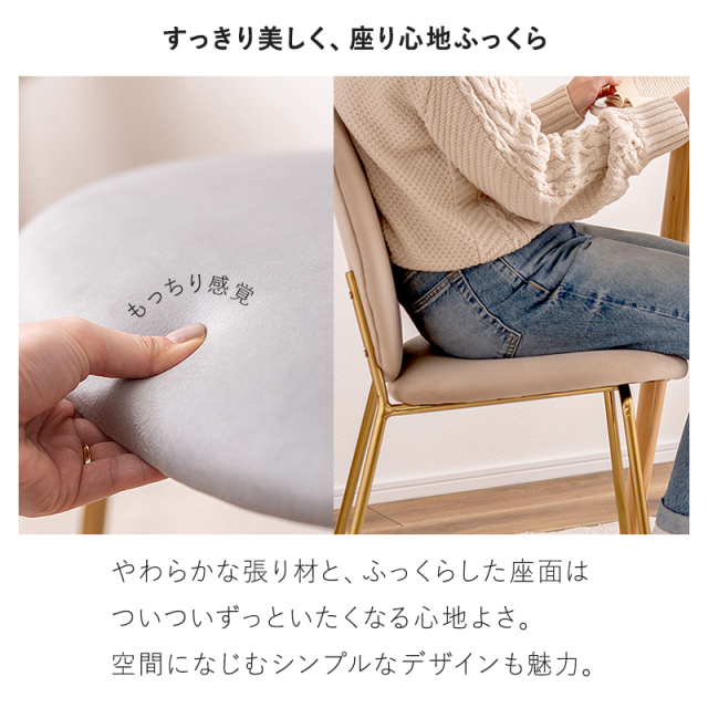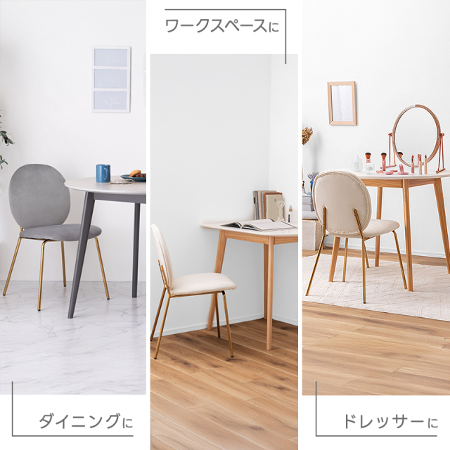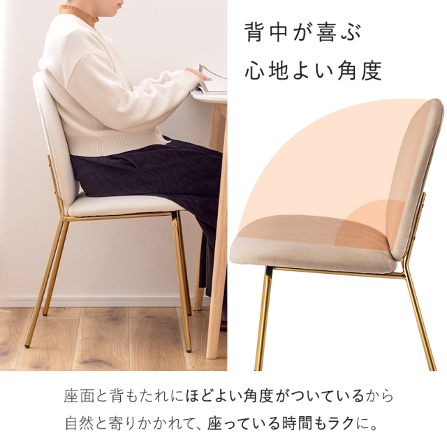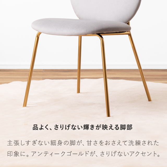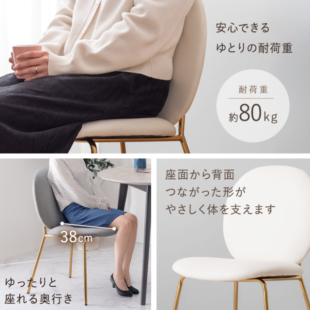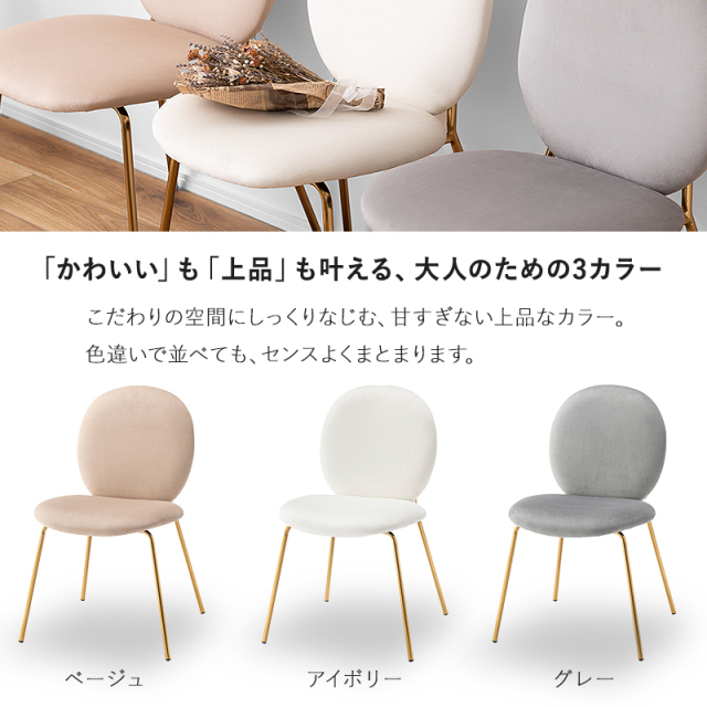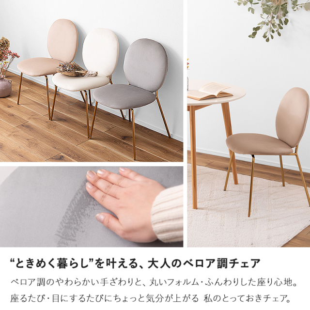 | ベロア調のやわらかい手ざわりと、丸いフォルム・ふんわりした座り心地。 座るたび・目にするたびにちょっと気分が上がる 私のとっておきチェア。 シンプルだからこそ、お部屋のテイストを問わず、どんな所にも合わせやすい。暮らしにすっとなじむ、頼れるチェアです。 こだわりの空間にしっくりなじむ、甘すぎない上品なカラー。色違いで並べても、センスよくまとまります。 ぷっくりとボリューミーな背面や座面で長く座っていたくなる心地よさ。 どなたにも使いやすい座面高さや余裕の耐荷重などチェアとしての機能もしっかり備わっています。 パーツが少なく、とても簡単に組み立てられるのもうれしいポイントです。 | |