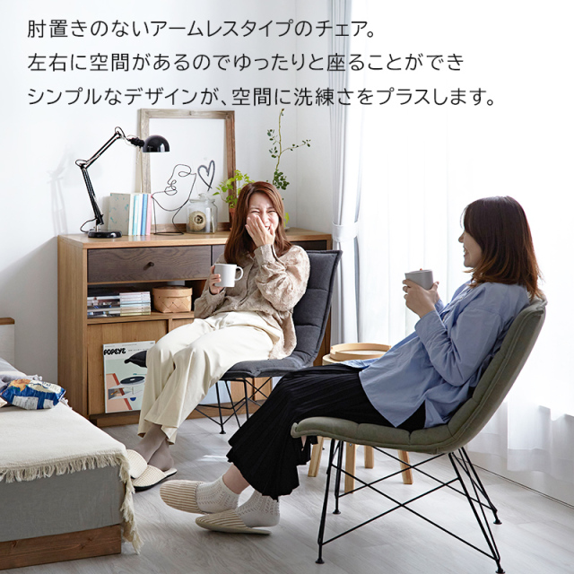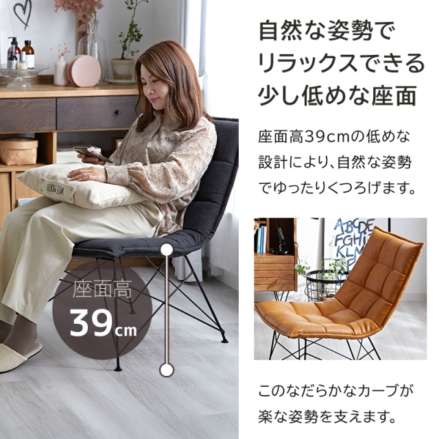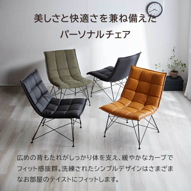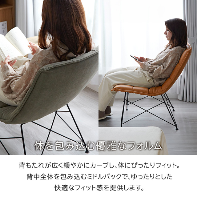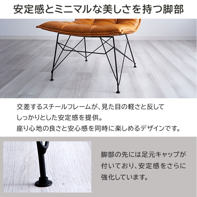 | リラックス感重視のちょっと低めのこのチェアは、座面と背面が一体化したデザインで、肩から腰まで体を包み込む快適な座り心地を実現。ボリュームのあるパイピングが高級感を演出し、耐久性も兼ね備えています。広い背もたれは緩やかなカーブで体にフィットし、長時間の使用でも疲れにくい仕様です。アームレストがなく、シンプルで洗練されたシルエットがどんな空間にもマッチします。足元キャップ付きの脚部で安定感も抜群。 張地もPUレザーとファブリックの2種類があり、それぞれ独特の味わいでお部屋をいろどります。 | |