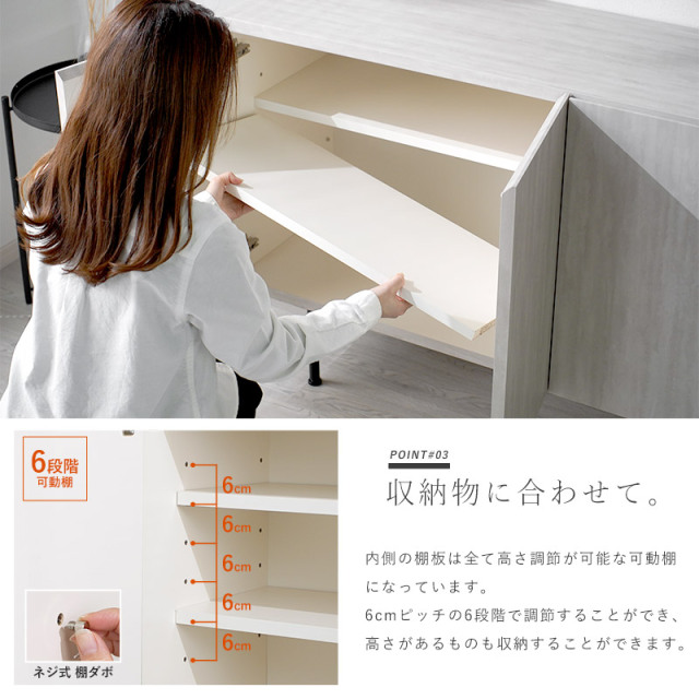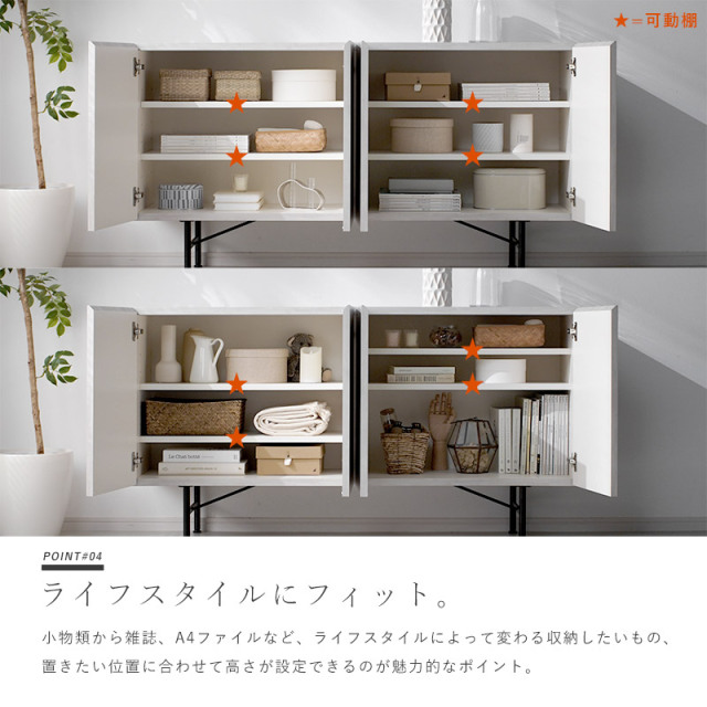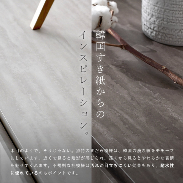 | まるで芸術作品のような印象を与える、デザインファニチャー セロ。 必要なものをそぎ落としたミニマムで凛とした佇まいは、生活感を隠し、お部屋を上質な空間へと引き立てます。 今回は、セロシリーズから サイドボード150サイズのご紹介です。 天板表面には、韓国の漉き紙をモチーフにした柄模様を採用しています。 独特なまだら模様は、近くで見ると陰影が感じられ、遠くから見るとやわらかな表情を魅せてくれます。 デザイン性の高さだけではなく、収納家具としてもしっかりと実力を備えています。 両開き式で見渡しやすく、取り出しやすい。内3段構造で収納物を仕分けすることができます。 扉の取っ手を省き、前板に指がかりのカットを施した引き算のデザインは、より美しさと上品さを引き立てます。 開閉機構にはソフトクローズを採用。扉が閉まる直前にブレーキがかかり、開閉時の衝突音や指はさみを防止します。 内側の棚板は全て高さ調節が可能な可動棚になっています。 6cmピッチの6段階で調節することができ、高さがあるものも収納することができます。 シンプルで洗練された、ホテルライクなインテリアを演出するセロシリーズをぜひご検討ください。 | |