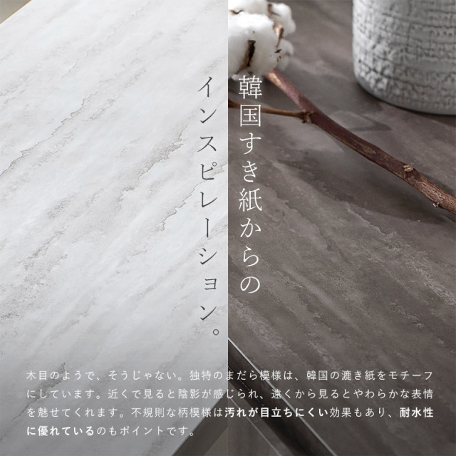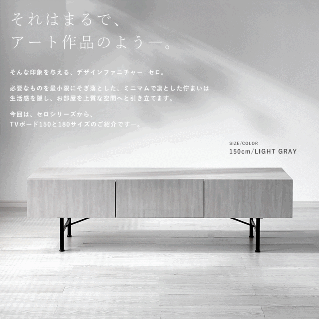 | まるで芸術作品のような印象を与える、デザインファニチャー セロ。 必要なものをそぎ落としたミニマムで凛とした佇まいは、生活感を隠し、お部屋を上質な空間へと引き立てます。 今回は、セロシリーズから テレビボード150cmと180cmサイズのご紹介です。 天板表面には、韓国の漉き紙をモチーフにした柄模様を採用しています。 独特なまだら模様は、近くで見ると陰影が感じられ、遠くから見るとやわらかな表情を魅せてくれます。 幅150cmと180cmの2サイズからお選びいただけます。 32Vの小さめサイズから60Vほどまでの各テレビサイズに対応。 設置テレビの重さは種類によって異なりますので、サイズ・重量をお確かめください。 中央部にはAV機器の収納スペースを確保。 ソフトダウンステーを採用し、ゆるやかな開閉で安心してお使いいただけます。 フラットなデザインに見えて、中央裏にはガラス板を使用しているので、扉を閉じていてもリモコンの電波が届きます。 両サイドにはフルスライドレールの引出し収納付き。 取っ手を省き、前板に指がかりのカットを施した引き算のデザインは、より美しさと上品さを引き立てます。 引き出しは置くまで見渡しやすく、取り出しやすい。小物類の収納場所として使い勝手のいい収納スペースです。 シンプルで洗練された、ホテルライクなインテリアを演出するセロシリーズをぜひご検討ください。 | |