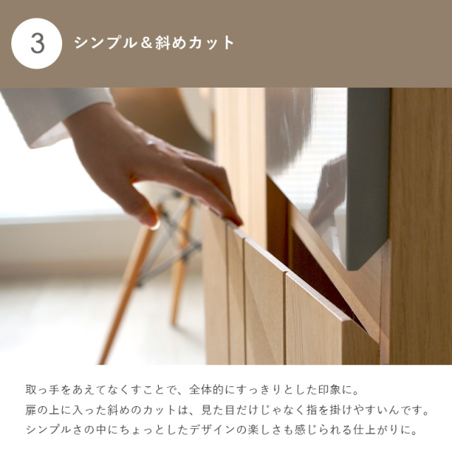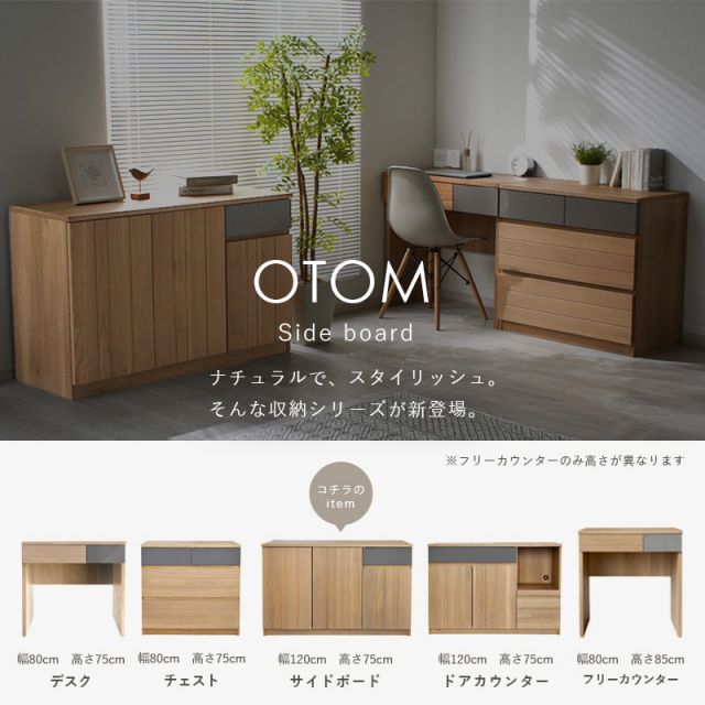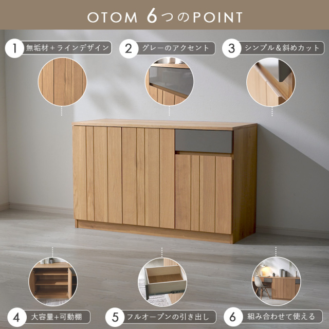 | 縦に走るラインが美しいオーク無垢材の前板に、落ち着いたグレーのアクセントを組み合わせたOTOMシリーズのサイドボード。 取っ手をなくしたシンプルデザインと扉上の斜めカットで、見た目の上品さと使いやすさを両立しました。 内部は大容量で、可動棚付きだから収納物に合わせて自在にレイアウト可能。食器から雑貨までしっかりと収められます。 ナチュラルな木目が空間にあたたかさを添えつつ、生活感を抑えたスタイリッシュな空間づくりに最適です。 日本製・大川家具の安心品質で、完成品をお届け。届いてすぐに快適にご使用いただけます。 | |