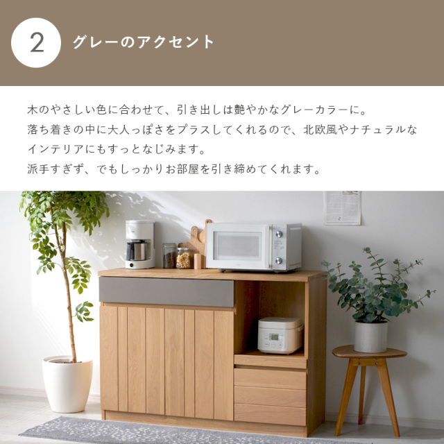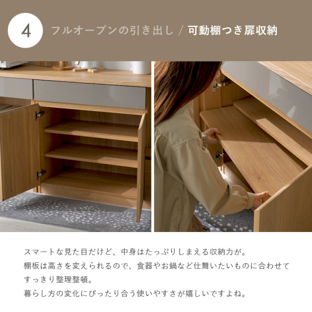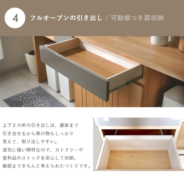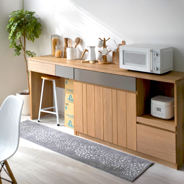 | オーク無垢材を贅沢にあしらった前板と、上品なグレーのアクセントが目を引くOTOMシリーズのドアカウンター。 すっきりとしたデザインに扉上の斜めカットを加え、シンプルでありながら使いやすさにもこだわりました。 電子レンジやコーヒーメーカーを置けるオープンスペースと、大容量の収納を組み合わせたつくりで、毎日の料理や片付けを快適にサポート。 引き出しは奥まで取り出しやすいフルオープン仕様で、湿気に強い桐材を使用。調理器具や食品のストックも安心して収納できます。 シリーズで揃えれば統一感のあるキッチンに。 日本製・大川家具の完成品で、すぐに快適にご利用いただけます。 | |