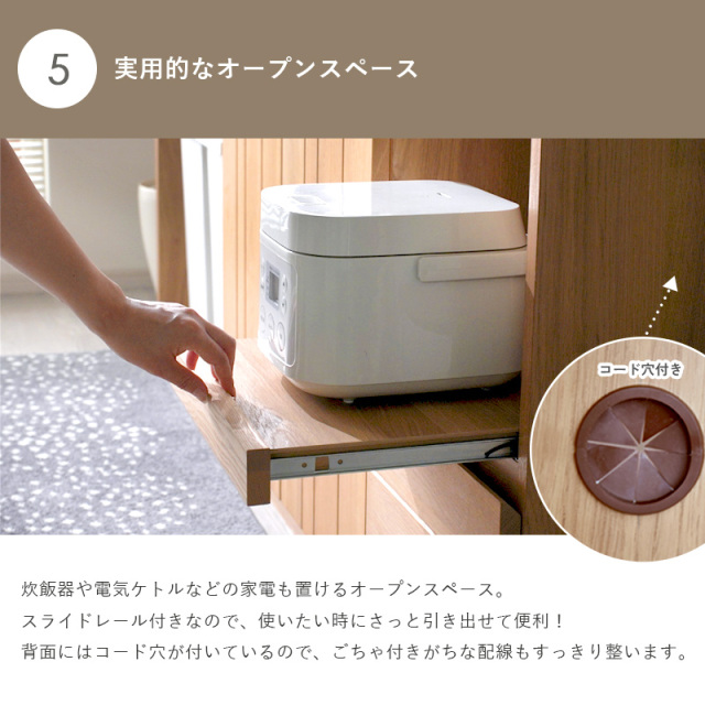 | 耐荷重 | 天板:(約)15kg 可動棚:(約)5kg オープン収納:(約)5kg 大引出:(約)8kg 小引出:(約)5kg 扉内収納:(約)5kg |