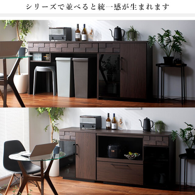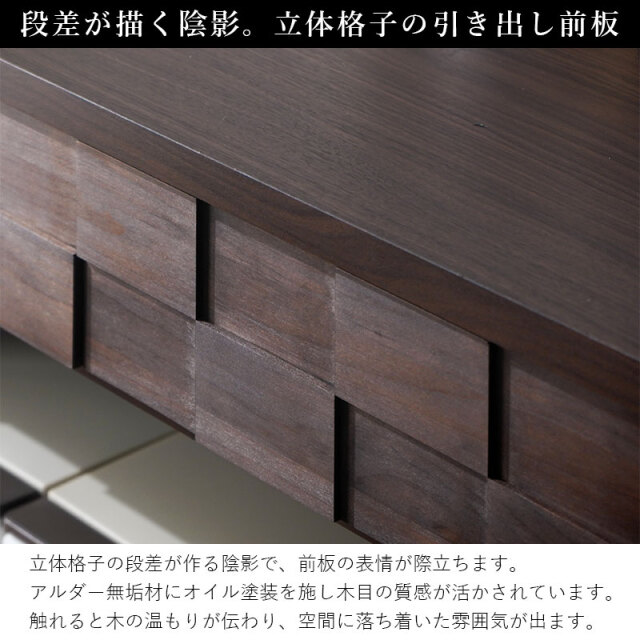 | 幅広天板は配膳や作業に最適な設計です。 横長引き出しで小物を整理、下段には3分別ゴミ箱も収納。 ダイニングやキッチンに自然に馴染むカウンターデスクです。 立体格子の段差が作る陰影で、前板の表情が際立ちます。 アルダー無垢材にオイル塗装を施し木目の質感が活かされています。 触れると木の温もりが伝わり、空間に落ち着いた雰囲気が出ます。 家電や食器を横並びに置いても作業面を確保できます。 盛り付け、下ごしらえ、ちょい置きまで一枚で完結。 配膳から片付けまでスムーズなダイニング用カウンターです。 | |